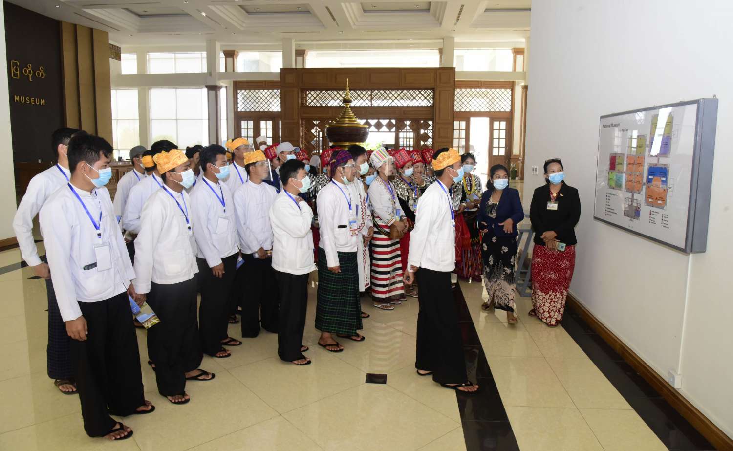 ထို့နောက် ယဉ်ကျေးမှုအဖွဲ့သည် နေပြည်တော် လွှတ်တော်အဆောက်အအုံများကို ဆက်လက်လေ့လာကြရာ ပြည်ထောင်စုလွှတ်တော် ဧည့်ကြိုဆိုရေး အဆောင်၌ ပြသထားသည့် မြန်မာ့ရိုးရာ ယဉ်ကျေးမှုအထိမ်းအမှတ်ဖြစ်သော ယွန်းထည်ဆွမ်းအုပ်ကြီးနှင့် သစ်အမျိုးအစား ၉၂ မျိုးတို့ကို ကြည့်ရှုကြပြီး မှတ်တမ်းတင်ဓာတ်ပုံများရိုက်ကြသည်။