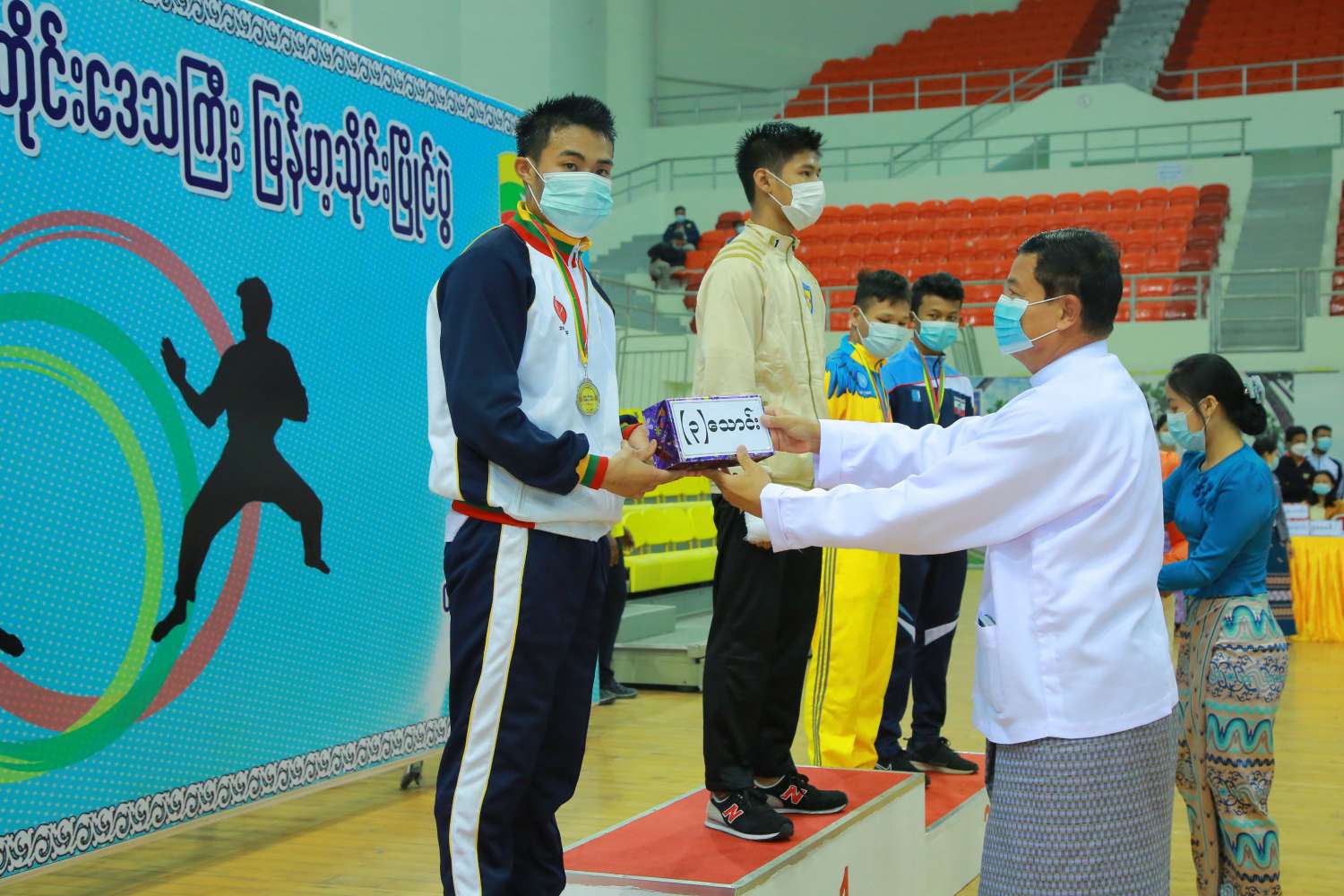 ဆက်လက်၍ နိုင်ငံတော်စီမံအုပ်ချုပ်ရေးကောင်စီဝင် ဦးမောင်းဟာက အမျိုးသား/အမျိုးသမီး လက်သိုင်းအတိုက်ပြိုင်ပွဲတွင် အကောင်းဆုံးဆုရရှိသည့် မောင်ဇွဲဝေယံဖြိုး (ရှမ်း)နှင့် မဆုမြတ်နိုး (တနင်္သာရီ)၊ ဓါးအတိုက်ပြိုင်ပွဲတွင် အကောင်းဆုံးဆုရရှိသည့် မောင်စိုင်းလင်းထွေး (ရှမ်း)နှင့် မဇင်မို့မို့ထွေး (မကွေး) တို့ကို အကောင်းဆုံးအားကစားသမားဆု (Trophy)နှင့် ဆုကြေးငွေများကိုလည်းကောင်း၊ နိုင်ငံတော်စီမံအုပ်ချုပ်ရေးကောင်စီဝင် Jeng Phang နော်တောင်က ရွှေ(၆)ခု၊ ငွေ(၆)ခု၊ ကြေး(၁)ခုဖြင့် အမျိုးသားတံခွန်စိုက်ဒိုင်းရရှိသည့် မန္တလေးတိုင်းဒေသကြီးအသင်းကိုလည်းကောင်း၊ နိုင်ငံတော်စီမံ အုပ်ချုပ်ရေးကောင်စီဝင် ဒေါ်အေးနုစိန်က ရွှေ (၇)ခု၊ ငွေ (၂)ခု၊ ကြေး (၅)ခု ဖြင့် အမျိုးသမီးတံခွန် စိုက်ဒိုင်းရရှိသည့် မန္တလေးတိုင်းဒေသကြီးအသင်းကို လည်းကောင်း၊ နိုင်ငံတော်စီမံအုပ်ချုပ်ရေးကောင်စီဝင် မန်းငြိမ်းမောင်က ရွှေ (၁၃)ခု၊ ငွေ (၈)ခု၊ ကြေး (၆)ခုဖြင့် စုပေါင်းတံခွန်စိုက်ဒိုင်းရရှိသည့် မန္တလေး တိုင်းဒေသကြီးအသင်းကိုလည်းကောင်း တံခွန်စိုက်ဒိုင်းဆုများ ပေးအပ်ချီးမြှင့်ခဲ့ကြသည်။