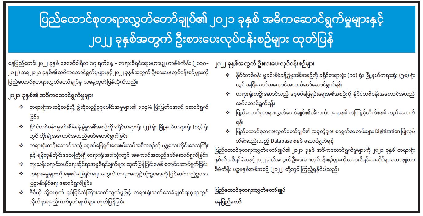 ပြည်ထောင်စုတရားလွှတ်တော်ချုပ်၏ ၂၀၂၁ ခုနှစ် အဓိကဆောင်ရွက်မှုများနှင့် ၂၀၂၂ ခုနှစ်အတွက် ဦးစားပေးလုပ်ငန်းစဉ်များထုတ်ပြန် 02/18/2022
