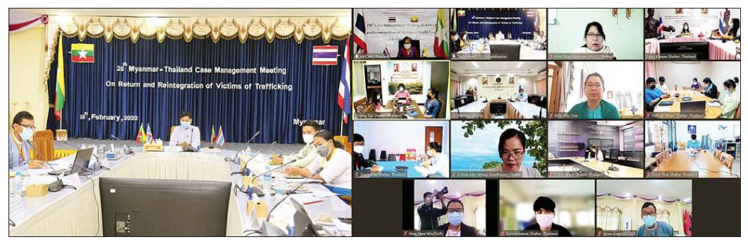 မြန်မာနိုင်ငံ လူမှုဝန်ထမ်း၊ ကယ်ဆယ်ရေးနှင့် ပြန်လည်နေရာချထားရေး ဝန်ကြီးဌာန၊ ပြန်လည် ထူထောင်ရေး ဦးစီးဌာနနှင့် ထိုင်းနိုင်ငံ လူမှုဖွံ့ဖြိုး တိုးတက်ရေးနှင့် လူထုလုံခြုံရေးဝန်ကြီး ဌာနတို့သည် (၂၆) ကြိမ်မြောက် မြန်မာ-ထိုင်းလူကုန်ကူးခံရသူများ ပြန်လည်လက်ခံရေး၊ မိဘရပ်ထံ ပြန်လည် အပ်နှံရေးနှင့်မိသားစု ပေါင်းစည်းရေးဆိုင်ရာဖြစ်ရပ် စီမံခန့်ခွဲမှုညှိနှိုင်းအစည်းအဝေးကို ယနေ့နံနက်ပိုင်းက ပြန်လည်ထူထောင်ရေးဦးစီးဌာန အစည်းအဝေး ခန်းမတွင် Virtual Meeting ဖြင့် ကျင်းပသည်။