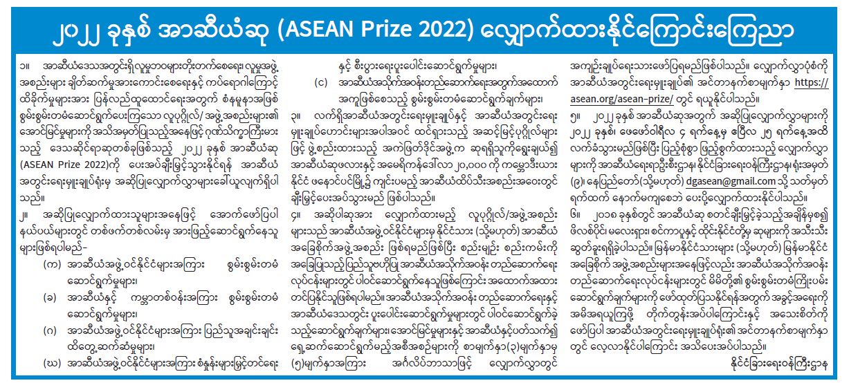 ၂၀၂၂ ခုနှစ် အာဆီယံဆု (ASEAN Prize 2022) လျှောက်ထားနိုင်ကြောင်းကြေညာ
