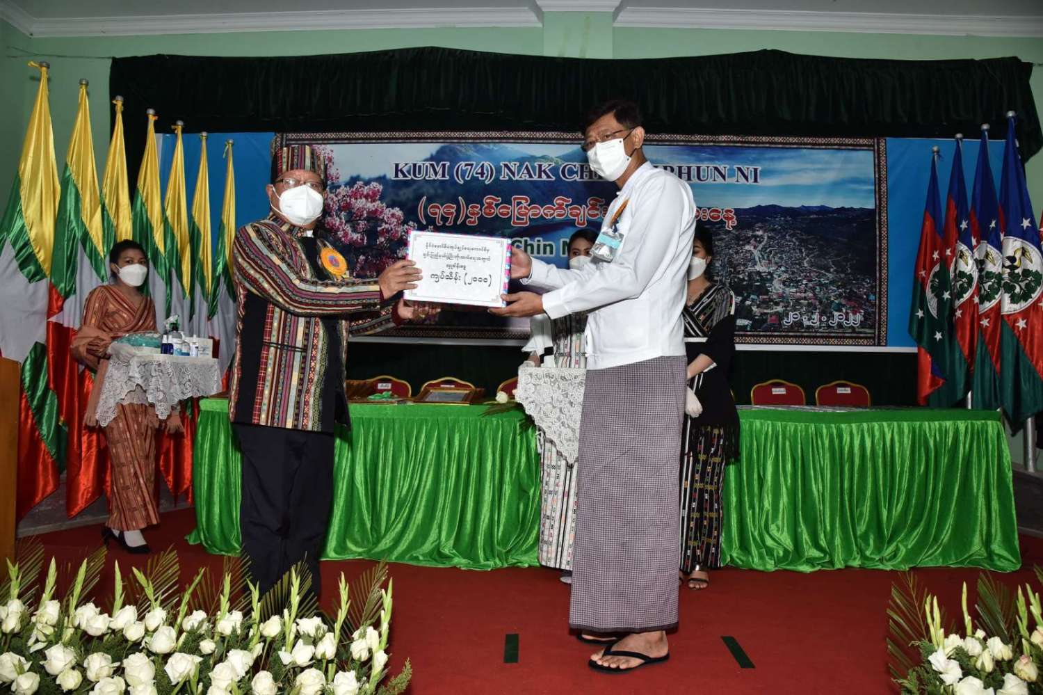 ထို့နောက် နိုင်ငံတော်စီမံအုပ်ချုပ်ရေးကောင်စီမှ ချင်းပြည်နယ် ဒေသဖွံ့ဖြိုး တိုးတက်ရေးအတွက် ပေးပို့သည့်လှူဒါန်းငွေ ကျပ်သိန်း(၂၀၀၀)နှင့် ကိုဗစ်-၁၉ ရောဂါကာကွယ်ရေးပစ္စည်းများအား နိုင်ငံတော်စီမံအုပ်ချုပ်ရေးကောင်စီ အဖွဲ့ဝင်ကာကွယ်ရေးဝန်ကြီးဌာန၊ ပြည်ထောင်စုဝန်ကြီး ဗိုလ်ချုပ်ကြီး မြထွန်းဦးမှ ပေးအပ်ခဲ့ပြီး ချင်းပြည်နယ်အစိုးရအဖွဲ့ကိုယ်စား ပြည်နယ်ဝန်ကြီးချုပ် ဦးငွန်ဆန်းအောင်မှ လက်ခံသည်။