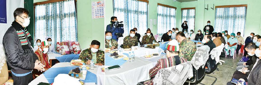 ချင်းပြည်နယ်၊ ဟားခါးမြို့၌ ရောက်ရှိနေသည့် နိုင်ငံတော်စီမံအုပ်ချုပ်ရေး ကောင်စီအဖွဲ့ဝင် ကာကွယ်ရေးဝန်ကြီးဌာန၊ ပြည်ထောင်စုဝန်ကြီး ဗိုလ်ချုပ်ကြီး မြထွန်းဦး၊ ဦးမောင်းဟာ တို့သည် ချင်းပြည်နယ်ဝန်ကြီးချုပ် ဦးငွန်ဆန်းအောင်၊ အနောက်မြောက်တိုင်းစစ်ဌာနချုပ်၊ ဒုတိယတိုင်းမှူး ဗိုလ်မှူးချုပ် မျိုးထွဋ်လှိုင်၊ ပြည်နယ်အစိုးရအဖွဲ့ဝင်များ၊ တာဝန်ရှိသူများနှင့် အတူ ယနေ့နံနက်ပိုင်းက ဟားခါးမြို့ ပြည်သူ့ဆေးရုံသို့ သွားရောက်ပြီး ပြည်သူ့ဆေးရုံ အုပ်ကြီးရုံးရှိ အစည်းအဝေးခန်းမ၌ ကျန်းမာရေးဝန်ထမ်းများနှင့် တွေ့ဆုံပွဲသို့တက် ရောက်ကြသည်။