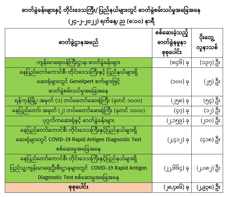 သို့ဖြစ်ပါ၍ ယနေ့အထိ ဓာတ်ခွဲနမူနာစုစုပေါင်း (၇,၀၂၈,၈၈၆)ခုအားစစ်ဆေးခဲ့ပြီး COVID-19 ဓာတ်ခွဲအတည်ပြုလူနာ စုစုပေါင်း (၅၇၈,၄၄၆) ဦး ရှိပြီဖြစ်ပါသည်။