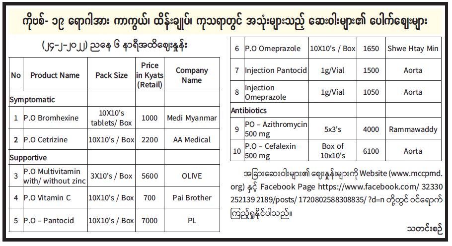 ကိုဗစ်- ၁၉ ရောဂါအား ကာကွယ်၊ ထိန်းချုပ်၊ ကုသရာတွင် အသုံးများသည့် ဆေးဝါးများ၏ ပေါက်ဈေးများ (၂၄-၂-၂၀၂၂)ညနေ ၆ နာရီအချိန်ထိဈေးနှုန်း 02/25/2022