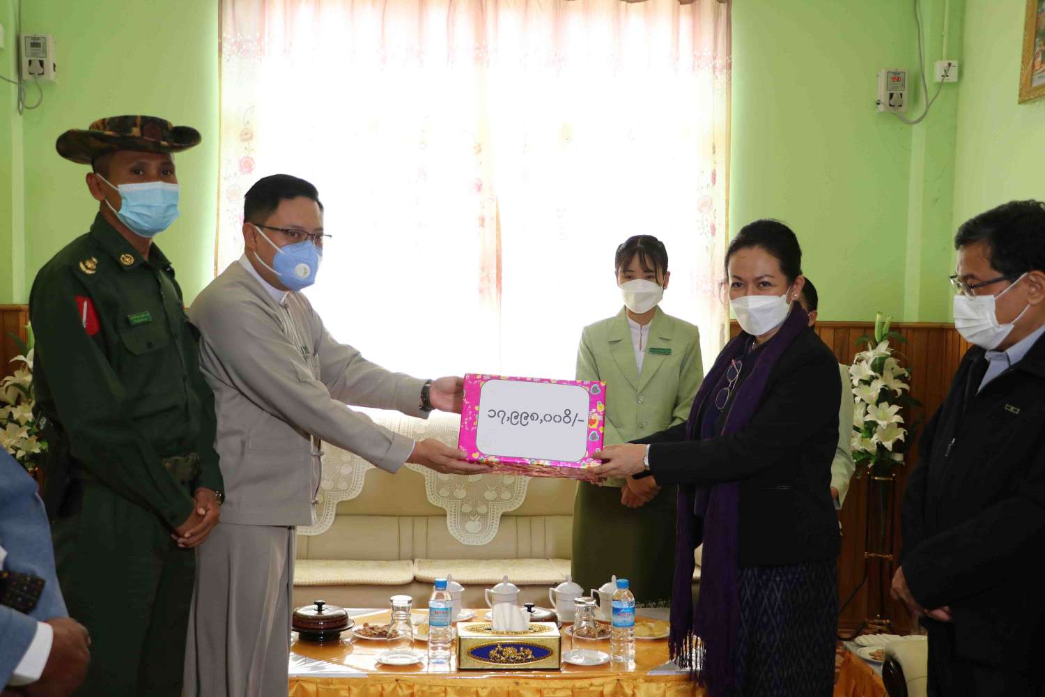 ထို့နောက် ပြည်ထောင်စုဝန်ကြီးနှင့် တာဝန်ရှိသူများသည် ဓနုကိုယ်ပိုင်အုပ်ချုပ်ခွင့်ရ ဒေသ၊ ရွာငံမြို့နယ်နှင့် ပင်းတယမြို့နယ်အတွင်း ဖေဖော်ဝါရီ ၅ ရက်ကဖြစ်ပွားခဲ့သော မိုးသီး ကြွေကျမှုကြောင့် ထိခိုက်ခံစားခဲ့ရသော အိမ်ထောင်စု (၄၂၈)စု၊ လူဦးရေ(၁၈၇၅)ဦးတို့အတွက် ဆန်ရိက္ခာဖိုး ထောက်ပံ့ငွေ ကျပ် (၁၇,၉၉၈,၀၀၀) ကိုလည်းကောင်း၊ ဘေးအန္တရာယ် ဆိုင်ရာစီမံခန့်ခွဲမှုဦးစီးဌာန ဘတ်ဂျက်မှ ထောက်ပံ့သည့် ဆန်ရိက္ခာဖိုး လှူဒါန်းငွေကျပ် (၁,၆၃၈,၀၀၀) ကိုလည်းကောင်း ထောက်ပံ့ ပေးအပ်ကြရာ အကျိုးခံစားခွင့်ရှိသူများကိုယ်စား ဓနုကိုယ်ပိုင်အုပ်ချုပ်ခွင့်ရဒေသ စီမံအုပ်ချုပ်ရေးအဖွဲ့ ဥက္ကဋ္ဌ ဦးအာကာလင်းနှင့် တာဝန်ရှိသူများက လက်ခံကြသည်။