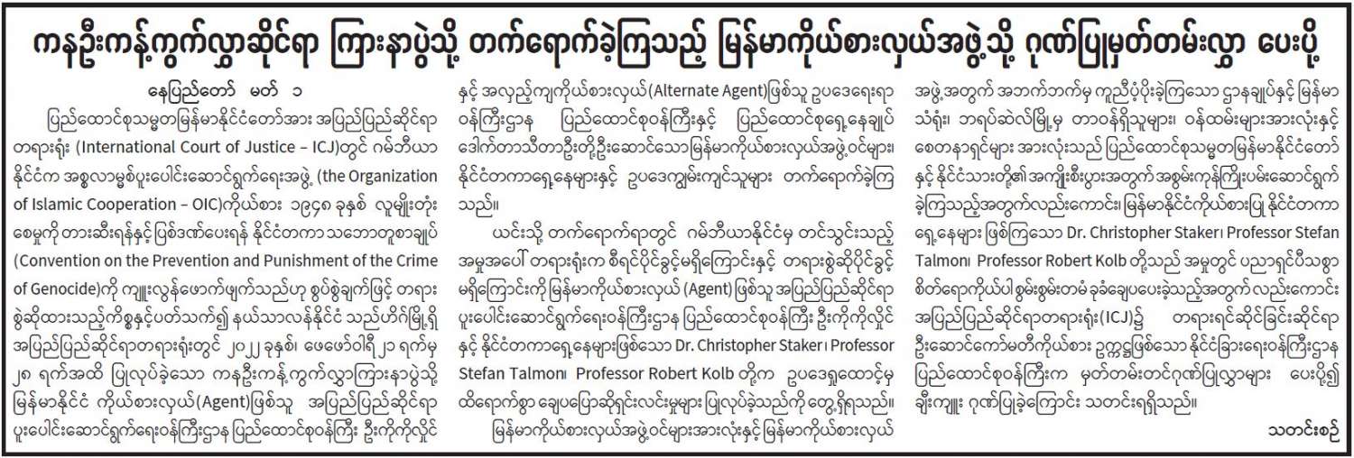 ကနဦးကန့်ကွက်လွှာဆိုင်ရာ ကြားနာပွဲသို့ တက်ရောက်ခဲ့ကြသည့် မြန်မာကိုယ်စားလှယ်အဖွဲ့သို့ ဂုဏ်ပြုမှတ်တမ်းလွှာ ပေးပို့ 03/01/2022