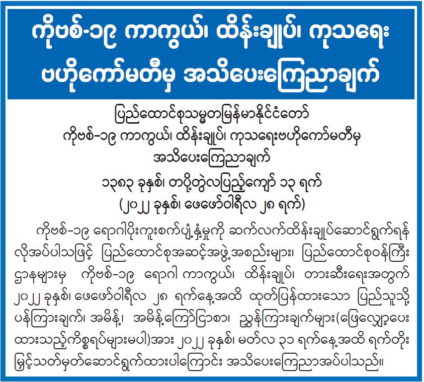 ကိုဗစ်-၁၉ ကာကွယ်၊ ထိန်းချုပ်၊ ကုသရေး ဗဟိုကော်မတီမှ အသိပေးကြေညာချက်