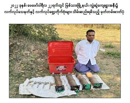 ဖမ်းဆီးရမိ တရားခံများ၏ ထွက်ဆိုချက်အရ ဖေဖော်ဝါရီလ ၂၂ ရက်တွင် ကျောက်ဆည်မြို့နယ်၊ သံရွာကျေးရွာ၌ ချစ်ပိုင်(၅၆)နှစ်အား ဖမ်းဆီးရမိခဲ့ပြီး ၎င်း၏ ထွက်ဆိုချက်အရ မြစ်သားမြို့နယ်၊ ကျွဲဆွဲကျေးရွာအနီး ၎င်းပိုင်ဆိုင်သော ယာခင်းအတွင်းမှ လက်လုပ်ပစ္စတို ၅ လက်၊ လက်လုပ်ရှော့ တိုက်ဗုံး ၄ လုံးတို့အား သိမ်းဆည်းရမိခဲ့သည်။