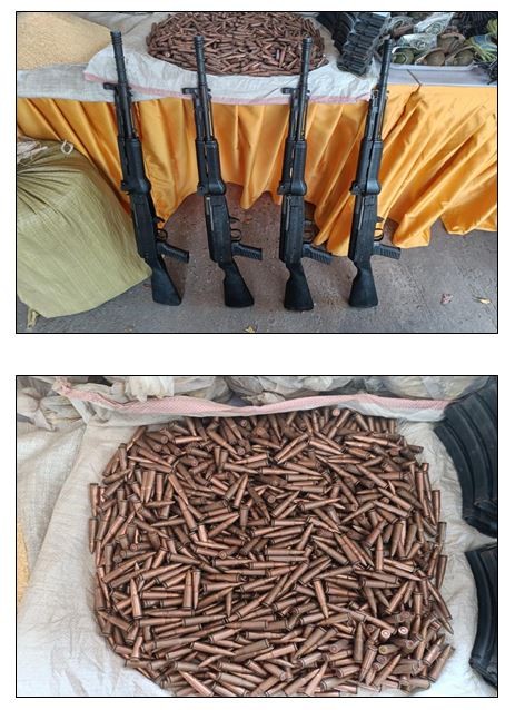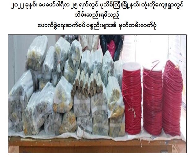 ဖြစ်စဉ်တွင် တရားခံကျား ၇ ဦး၊ မ ၃ ဦးပေါင်း ၁၀ တို့အား KA-25 ၄ လက်၊ လက်လုပ်ပစ္စတို ၅ လက်၊ လက်လုပ်ရှော့တိုက်ဗုံး ၄ လုံး၊ ကျည်အိမ် ၁၂ ခု၊ ၇.၆၂ ကျည် ၁,၀၀၀ တောင့်၊ လက်ပစ်ဗုံး ၃၄ လုံး၊ လက်လုပ်မိုင်း ၃၄ လုံး၊ လွယ်ကြိုး ၂ ချောင်း၊ ယမ်းတောင့် ၁,၆၉၅ ချောင်း၊ ဒီတိုနေတာ ၄,၉၄၀ ချောင်း၊ ယမ်းကြိုး ၃ ခွေ၊ TNT ယမ်းပြင်းမှုန့် ၁ အိတ်၊ ငွေကျပ် ၉၀ သိန်း၊ ဖောက်ခွဲရေးဆက်စပ်ပစ္စည်းများ နှင့်အတူ ဖမ်းဆီးရမိခဲ့သည်။