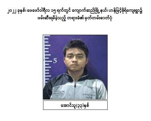 သို့ဖြစ်ပါ၍ ဖမ်းဆီးရမိ တရားခံများအား ဥပဒေအရ ထိရောက်စွာ အရေးယူနိုင်ရေး ဆက်လက်ဆောင်ရွက်သွားမည်ဖြစ်ပြီး အကြမ်းဖက်မှု ဆောင်ရွက်နေသူများအား ပြည်သူတစ်ရပ်လုံးက ဝိုင်းဝန်းကာကွယ် တိုက်ဖျက်ကြရန်နှင့် ပြစ်မှုကျူးလွန်ရာတွင် ပါဝင်ပတ်သက်သူများ၊ နောက်ကွယ်မှ ထောက်ပံ့ပေးလျက်ရှိသော ဆက်စပ်တရားခံများအား အမြန်ဆုံးဖမ်းဆီးရမိရေးအတွက် ၎င်းတို့ ပုန်းခိုရာနေရာများ၊ လှုပ်ရှားသွားလာနေထိုင်မှု သတင်းများရရှိပါက သက်ဆိုင်ရာသို့ လျှို့ဝှက်စွာ သတင်းပေးတိုင်ကြား နိုင်ပါကြောင်း၊ သတင်းပေးသူနှင့် ဖမ်းဆီးပေးသူ များအား ထိုက်တန်စွာ လျှို့ဝှက်၍ ဆုငွေများ ချီးမြှင့်ပေးမည်ဖြစ်ကြောင်းနှင့် မြို့ရွာများ အမြန်ဆုံးအေးချမ်း တည်ငြိမ်ရေးအတွက် ပြည်သူတစ်ရပ်လုံး ပူးပေါင်းပါဝင် ကြိုးပမ်းဆောင်ရွက်နိုင်ပါရန် မေတ္တာရပ်ခံအပ်ပါကြောင်း အသိပေး သတင်းထုတ်ပြန်အပ်ပါသည်။
