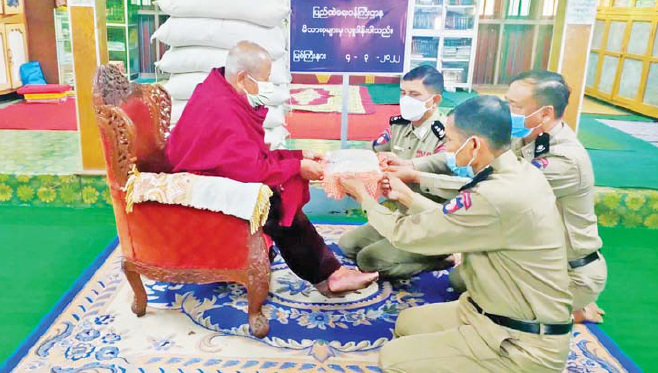 ထိုသို့ဆောင်ရွက်လျက်ရှိရာ ယနေ့တွင် နေပြည်တော်ကောင်စီနယ်မြေ ပျဉ်းမနားမြို့နယ်ရှိ ဝိပဿနာကျောင်းတိုက်သို့ လည်းကောင်း၊ ကချင်ပြည်နယ် မြစ်ကြီးနားမြို့နယ်ရှိ ဘုရားကြီးကျောင်းတိုက်သို့ လည်းကောင်း၊ ကရင်ပြည်နယ် ဘားအံမြို့နယ်ရှိ သရက်တောကျောင်းတိုက်သို့ လည်းကောင်း၊ မွန်ပြည်နယ် သထုံမြို့နယ်ရှိ လယ်ဝန်ကျောင်းတိုက်သို့ လည်းကောင်း၊ ရခိုင်ပြည်နယ် ဘူးသီးတောင်မြို့နယ်ရှိ သာသနာ့အလင်းရောင်ကျောင်းတိုက်သို့ လည်းကောင်း၊ ရန်ကုန်တိုင်းဒေသကြီး အင်းစိန်မြို့နယ်ရှိ အောင်မင်္ဂလာကျောင်းတိုက်သို့ လည်းကောင်း ဆရာတော်၊ သံဃာတော်များအတွက် ဆွမ်းဆန်တော်များကို ပြည်ထဲရေးဝန်ကြီးဌာန၊ တပ်ဖွဲ့/ဦးစီးဌာနများမှ သက်ဆိုင်ရာ နေပြည်တော်ကောင်စီနယ်မြေနှင့် တိုင်းဒေသကြီး/ ပြည်နယ်တို့ရှိ တာဝန်ရှိသူများက သွားရောက်ဆက်ကပ် လှူဒါန်းခဲ့ကြကြောင်း သိရသည်။