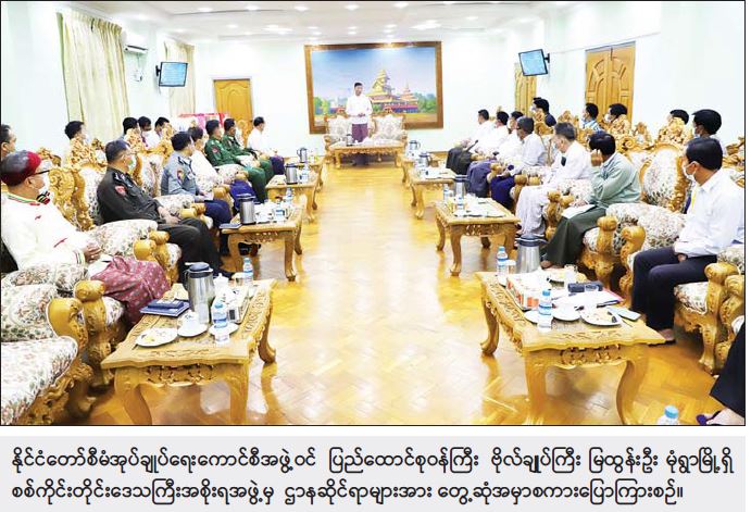 တွေ့ဆုံစဉ် နိုင်ငံတော်စီမံအုပ်ချုပ်ရေးကောင်စီအဖွဲ့ဝင် ကာကွယ်ရေးဝန်ကြီးဌာန ပြည်ထောင်စုဝန်ကြီး ဗိုလ်ချုပ်ကြီး မြထွန်းဦး က အမှာစကားပြောကြားပြီး စစ်ကိုင်းတိုင်းဒေသကြီးအစိုးရအဖွဲ့ ဝန်ကြီးချုပ် ဦးမြတ်ကျော်နှင့် တာဝန်ရှိသူများက ဒေသဖွံ့ ဖြိုးရေး၊ တရားဥပဒေစိုးမိုးရေးနှင့် နယ်မြေလုံခြုံရေးစီမံဆောင်ရွက်ထားရှိမှု အခြေအနေများ၊ စိုက်ပျိုးရေးကဏ္ဍ ဆောင်ရွက်ထားရှိမှု အခြေအနေများ၊ မွေးမြူရေးကဏ္ဍ ဆောင်ရွက်ထားရှိမှု အခြေအနေများ၊ ကိုဗစ်-၁၉ ကာကွယ်ဆေးထိုးနှံမှု အခြေအနေများနှင့် ရောဂါကာကွယ် ထိန်းချုပ်ရေး ဆောင်ရွက်ထားရှိမှုအခြေအနေများ၊ အခြေခံပညာကျောင်းများ ဖွင့်လှစ်ဆောင်ရွက်ထားရှိမှု အခြေအနေများ၊ ပန်းခင်းစီမံချက် ဆောင်ရွက်ထားရှိမှုအခြေအနေများနှင့် တိုင်းဒေသကြီးအတွင်းရှိ လမ်းမကြီးများအခြေအနေများကို ရှင်းလင်းတင်ပြခဲ့ပြီး နိုင်ငံတော် စီမံအုပ်ချုပ်ရေးကောင်စီအဖွဲ့ဝင် ကာကွယ်ရေးဝန်ကြီးဌာန၊ ပြည်ထောင်စုဝန်ကြီးက တင်ပြချက် များအပေါ် လိုအပ်သည်များကို ညှိနှိုင်းဆောင်ရွက်ပေးသည်။ ထို့နောက် စစ်ကိုင်းတိုင်းဒေသကြီး အစိုးရအဖွဲ့ရုံး၊ ချင်းတွင်းခန်းမ၌ ဌာနဆိုင်ရာများကိုယ်စား တာဝန်ရှိသူများကို လက်ဆောင်ပစ္စည်များ ပေးအပ်ခဲ့ပြီး ချင်းတွင်းရိပ်သာ(၁)၌ မုံရွာမြို့၊ ရပ်မိရပ်ဖများနှင့် ရင်းရင်းနှီးနှီးတွေ့ဆုံနှုတ်ဆက်ကာ အမှတ်တရလက်ဆောင်ပစ္စည်းများ ပေးအပ်ခဲ့ကြောင်း သတင်းရရှိသည်။