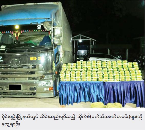 မူးယစ်ဆေးဝါး တားဆီးနှိမ်နင်းရေးရဲတပ်ဖွဲ့ဝင်များ ပါဝင်သော ပူးပေါင်းအဖွဲ့သည် ဖေဖော်ဝါရီ ၂၆ ရက် ညနေ ၃ နာရီခွဲတွင် ရှမ်းပြည်နယ်(တောင်ပိုင်း) ကွန်ဟိန်းမြို့နယ် တောင်ကြီး - တာချီလိတ်သွား ကားလမ်း တာကော်တံတား ပူးပေါင်းစစ်ဆေးရေးစခန်းတွင် ကာလိမှ မိုင်းပျဉ်း ဘက်သို့ စိုင်းပေါင်းနွံခမ်း (ခ) ခမ်းဟန်စင့်(၃၀)နှစ် မောင်းနှင်လာသည့် Nissan Diesel ၁၂ ဘီး ယာဉ်ကို သတင်းအရ ရှာဖွေရာ အိုက်စ် (မက်သ်အဖက်တမင်း) ကီလို ၁၅၀ နှင့် စိတ်ကြွရူးသွပ်ဆေးပြား ကိုးသိန်း သိမ်းဆည်းရမိခဲ့ပြီး သတင်းကွင်းဆက်အရ ၂၇ ရက် နံနက် ၁၀ နာရီတွင် ရှမ်းပြည်နယ် (အရှေ့ပိုင်း) မိုင်းပျဉ်းမြို့နယ် တောင်ကြီး -တာချီလိတ် သွားကားလမ်း မိုင်တိုင်အမှတ် (၂၈၄)အနီး ကားလမ်းဘေးတွင် ရပ်တန့်ထားသည့် Nissan Diesel ၁၂ ဘီးယာဉ်ကို စစ်ဆေးရှာဖွေရာ အိုက်စ် (မက်သ်အဖက်တမင်း) ကီလို ၄၀၀ ထပ်မံသိမ်းဆည်းရမိခဲ့သဖြင့် ဒေသကာလတန်ဖိုး ငွေကျပ် ၅ဒသမ ၅ ဘီလီယံကျော် တန်ဖိုးရှိ စုစုပေါင်း အိုက်စ်(မက်သ် အဖက်တမင်း) ၅၅၀ ကီလို၊ စိတ်ကြွရူးသွပ်ဆေးပြား ကိုးသိန်း သိမ်းဆည်းရမိခဲ့ကြောင်း၊ စစ်ဆေး ဖော်ထုတ်ချက်များအရ သိမ်းဆည်းရမိ မူးယစ်ဆေးဝါးများကို ရှမ်းပြည်နယ်(အရှေ့ပိုင်း) နယ်စပ်မှ တစ်ဆင့် ပြည်ပသို့ သယ်ဆောင်ခြင်းဖြစ်ကြောင်း သိရသဖြင့် ဥပဒေအရ အရေးယူထားရှိပြီး ကွင်းဆက်ပြစ်မှုကျူးလွန်သူများကို ဆက်လက်စစ်ဆေး ဖော်ထုတ်လျက်ရှိကြောင်း သိရသည်။