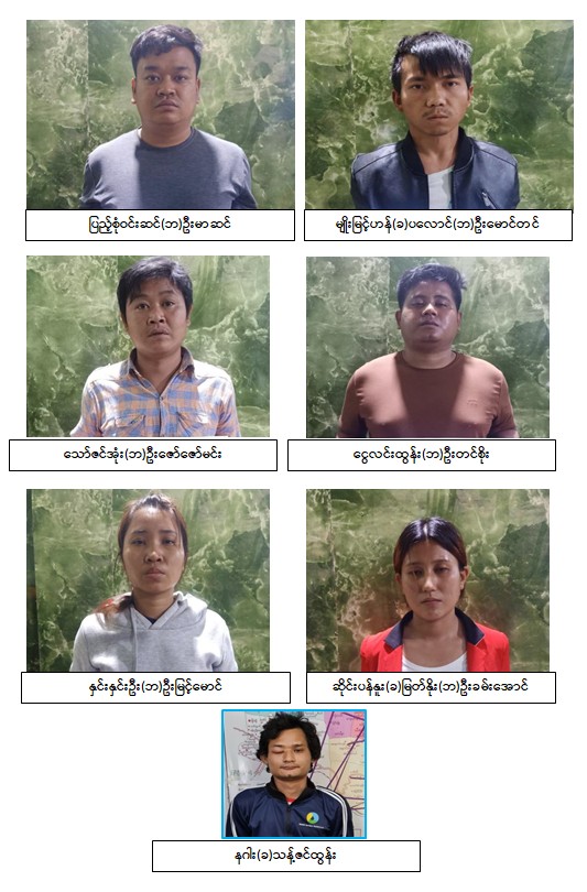 သော်ဇင်အုံး၏ထွက်ဆိုချက်အရ အထူးအမှုစစ်အဖွဲ့သည် ပြစ်မှုကျူးလွန်သူများအား ဖမ်းဆီးရမိနိုင်ရေး ဆောင်ရွက်ခဲ့ရာ မတ်လ ၆ ရက်နေ့ နံနက် ၈ နာရီ ၁၀ မိနစ်အချိန်တွင် ရှမ်းပြည်နယ်(မြောက်ပိုင်း)၊ နောင်ချိုမြို့နယ်၊ တောင်ရပ်ကွက်နေ ငွေလင်းထွန်း(၂၈)နှစ် (ဘ)ဦးတင်စိုးနှင့် ၎င်း၏ရည်းစားဖြစ်သူ ဘူတာရပ်ကွက်နေ နှင်းနှင်းဦး(၃၀)နှစ် (ဘ)ဦးမြင့်မောင်တို့ ၂ ဦးအား ချမ်းမြသာစည်မြို့နယ်၊ အောင်ပင်လယ်ရပ်ကွက် ၄၇ လမ်းနှင့် ၄၈ လမ်းကြား၊ (၁၀၅)လမ်းရှိ “ထွန်း”တည်းခိုခန်းအရှေ့၌ လည်းကောင်း၊ နံနက် ၈ နာရီ ၅၅ မိနစ်အချိန်တွင် နောင်ချိုမြို့နယ်၊ ဘူတာရပ်ကွက်နေ ပြည့်စုံဝင်းဆင် (၂၉)နှစ် (ဘ)ဦးမာဆင်းနှင့် ဇနီးဖြစ်သူ မဆိုင်းပန်နူး (ခ)မြတ်နိုး (၂၇)နှစ် (ဘ)ဦးခမ်းအောင်တို့ ၂ ဦးအား ပြည်ကြီးတံခွန်မြို့နယ်၊ တံခွန်တိုင်အဝိုင်းအနီး အဝေးပြေးယာဉ် ရပ်နားသည့်နေရာ၌ လည်းကောင်း အသီးသီးဖမ်းဆီးရမိခဲ့ပြီး ၎င်းတို့ ၄ ဦးထံမှ လက်ကိုင်ဖုန်း ၅ လုံးနှင့် Tablet ၁ လုံး၊ မြန်မာငွေစက္ကူရောရာ ၆၈ သိန်း၊ အလေးချိန် ၁ ကျပ် ၆ ပဲ ၁ ရွေးခန့်ရှိ ရွှေဆွဲကြိုး ၁ ကုံး၊ အလေးချိန် ၆ ပဲ ၅ ရွေးရှိ ရွှေဆွဲကြိုး ၁ ကုံး၊ အလေးချိန် ၃ ပဲ ၇ ရွေးရှိ လက်စွပ် ၁ ကွင်း၊ မှတ်ပုံတင် ၅ ခု၊ KBZ ငွေစုဘဏ်စာအုပ် ၂ အုပ်၊ လက်ပတ်နာရီ ၁ လုံး၊ လက်ကိုင်ကျောပိုး အိတ် ၉ လုံးတို့အား သိမ်းဆည်းရမိခဲ့ပြီး မျိုးမင်းဟန်(ခ) ပလောင် (၂၆)နှစ် (ဘ)ဦးမောင်တင်အား နံနက် ၉ နာရီအချိန်တွင် နောင်ချိုမြို့နယ်၊ ဘူတာရပ်ကွက်၊ မန္တလေး-လားရှိုးကားလမ်းဘေးရှိ “ရဲလင်းထွန်း” လေ/ဂဟေဆက်ဆိုင်တွင်လည်းကောင်း ထပ်မံဖမ်းဆီးရမိခဲ့ပါသည်။