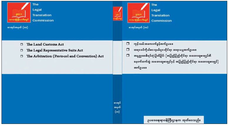 ဥပဒေဘာသာပြန် ကော်မရှင်အဖွဲ့သည် ပြည်ထောင်စုသမ္မတ မြန်မာနိုင်ငံတော်တွင် အင်္ဂလိပ်ကိုလိုနီခေတ်က အင်္ဂလိပ်ဘာသာဖြင့် ပြဋ္ဌာန်းထားသော တည်ဆဲဥပဒေများကို မြန်မာဘာသာသို့ ပြန်ဆိုလျက်ရှိရာ ယခုအကြိမ်တွင် The Land Customs Act ကို ကုန်းလမ်း အကောက်ခွန် အက်ဥပဒေအဖြစ် လည်းကောင်း၊ The Legal Representatives Suits Act ကို တရားဝင်ကိုယ်စားလှယ်များဆိုင်ရာ တရားမမှု အက်ဥပဒေအဖြစ် လည်းကောင်း၊ The Arbitration (Protocol and Convention) Act ကို အနုညာတစီရင် ဆုံးဖြတ်ခြင်း (အပြည်ပြည်ဆိုင်ရာ သဘောတူစာချုပ်၏ နောက်ဆက်တွဲ သဘောတူစာချုပ်နှင့် အပြည်ပြည်ဆိုင်ရာ သဘောတူစာချုပ်) အက်ဥပဒေအဖြစ် လည်းကောင်း မြန်မာဘာသာသို့ ပြန်ဆိုခဲ့ခြင်း ဖြစ်သည်။