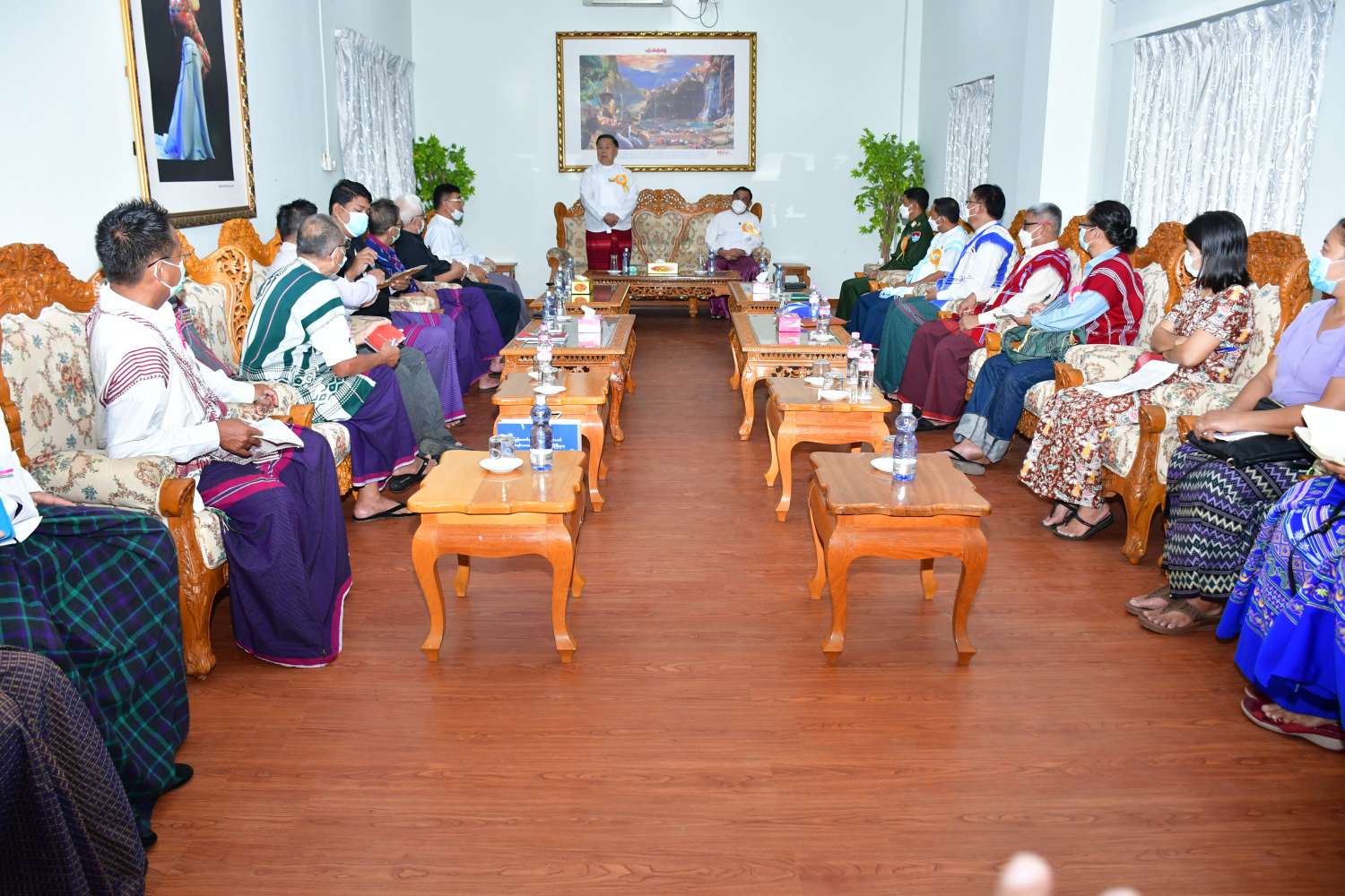 တွေ့ဆုံစဉ် ပြည်ထောင်စုဝန်ကြီးက မိမိတို့အနေဖြင့် တိုင်းရင်းသားများ၏ လူမှုစီးပွား ဘဝဖွံ့ဖြိုး တိုးတက်ရေး ကိစ္စရပ်များကို ကိုယ်စွမ်း ဉာဏ်စွမ်းရှိသမျှ အကောင်းဆုံး ကြိုးစား ဆောင်ရွက်လျက်ရှိပါကြောင်း၊ နိုင်ငံတော်စီမံအုပ်ချုပ်ရေးကောင်စီသည် ငြိမ်းချမ်းရေးနှင့် တိုင်းပြည် ဖွံ့ဖြိုးတိုးတက်ရေးကို ရှေးရှု၍ တစ်နိုင်ငံလုံး အပစ်ခတ်ရပ်စဲရေး သဘောတူစာချုပ် (NCA)ပါ သဘောတူညီချက်များကို အလေးထား ဆောင်ရွက်လျက်ရှိပါကြောင်း၊ နိုင်ငံတော်က ဆောင်ရွက်နေသည့် “ပန်းခင်းစီမံချက်” အိမ်ထောင်စုလူဦးရေစာရင်းနှင့် နိုင်ငံသားစိစစ်ရေး ကတ်ပြားများ ထုတ်ပေးခြင်းလုပ်ငန်းသည် တရားမျှတသော ပါတီစုံဒီမိုကရေစီ အထွေထွေရွေးကောက်ပွဲ ပြန်လည်ကျင်းပနိုင်ရေးအတွက် အရေးကြီးသဖြင့် တိုင်းရင်းသားများအားလုံး ပူးပေါင်းပါဝင်ကူညီ ဆောင်ရွက်ကြစေလိုပါကြောင်း ပြောကြားသည်။
