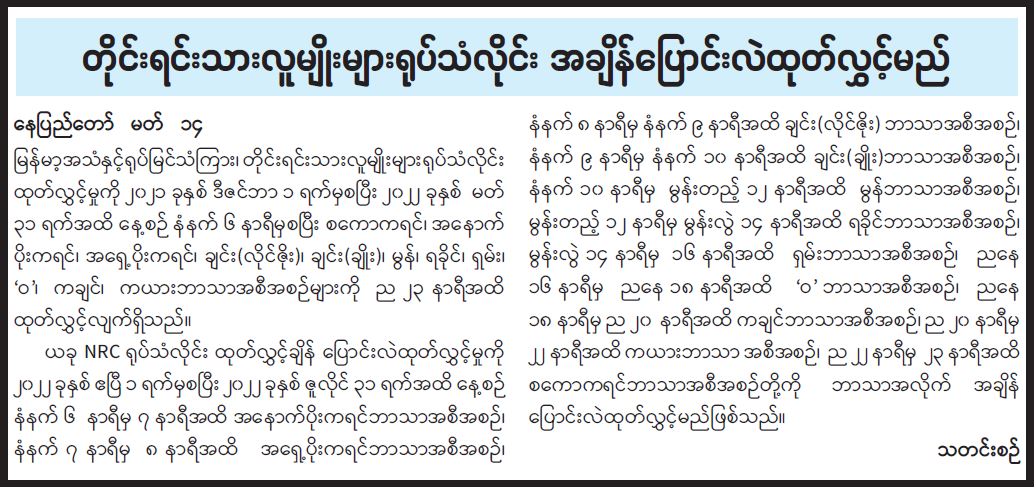 တိုင်းရင်းသားလူမျိုးများရုပ်သံလိုင်း အချိန်ပြောင်းလဲထုတ်လွှင့်မည် 03/15/2022 တိုင်းရင်းသားလူမျိုးများရုပ်သံလိုင်း အချိန်ပြောင်းလဲထုတ်လွှင့်မည်