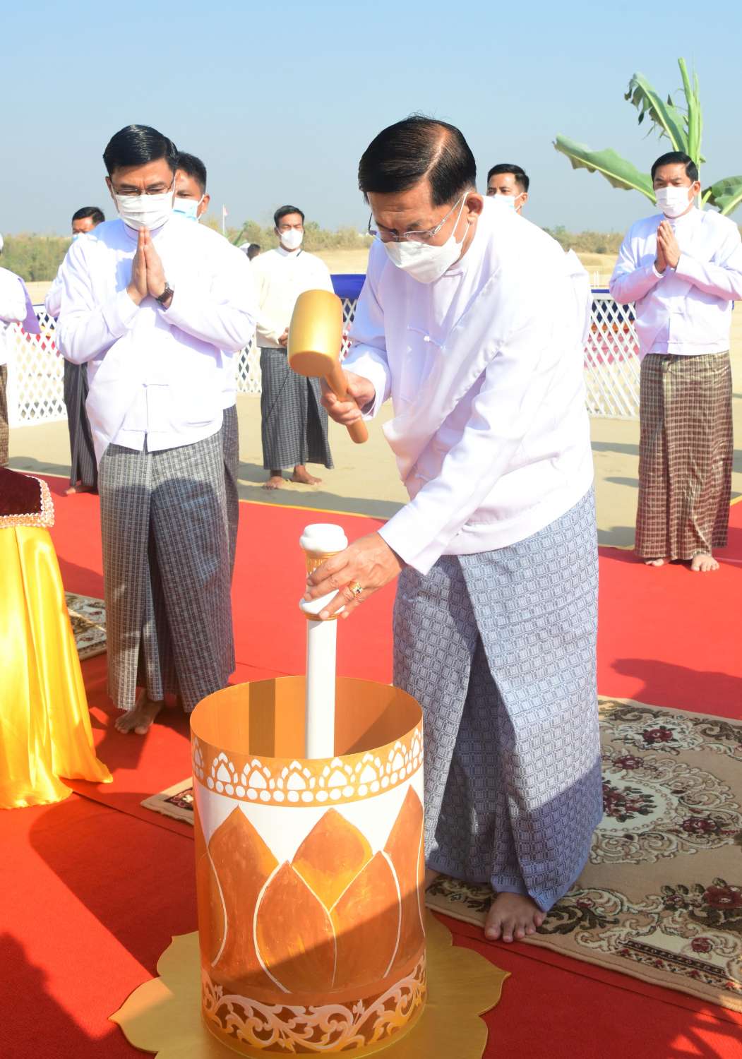 ယင်းနောက် ဦးဆောင်ဘုရားဒါယကာ နိုင်ငံတော်စီမံအုပ်ချုပ်ရေးကောင်စီဥက္ကဋ္ဌ နိုင်ငံတော်ဝန်ကြီးချုပ်နှင့် အဖွဲ့ဝင်များသည် ပန္နက်တော်စိုက်ထူပူဇော်သည့် ရှေးထုံးစဉ်လာ ကျမ်းဂန်တော်လာ အစဉ်အလာမြတ်များနှင့်အညီ ကျောက်စာရုံစေတီ ဗဟိုပန္နက်တော်ဌာနတွင် နေရာယူကြသည်။ ထို့နောက် မင်္ဂလာအချိန်တွင် ဦးဆောင် ဘုရားဒါယကာ နိုင်ငံတော်စီမံအုပ်ချုပ်ရေးကောင်စီဥက္ကဋ္ဌ နိုင်ငံတော်ဝန်ကြီးချုပ်က ကျောက်စာရုံစေတီ ဗဟိုပန္နက်တော်ဋ္ဌာနတွင် ရတနာပန္နက်တော်ကို စိုက်ထူ၍ ပရိတ်နံ့သာရည်များ ပက်ဖျန်းပူဇော်သည်။