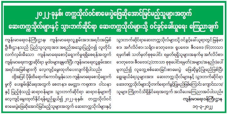 ၂၀၂၂ - ခုနှစ်၊ တက္ကသိုလ်ဝင်စာမေးပွဲ ဖြေဆိုအောင်မြင်မည့်သူများအတွက် ဆေးတက္ကသိုလ်များနှင့် သွားဘက်ဆိုင်ရာ ဆေးတက္ကသိုလ်များသို့ ဝင်ခွင့်ခေါ်ယူရေး ကြေညာချက် 03/19/2022