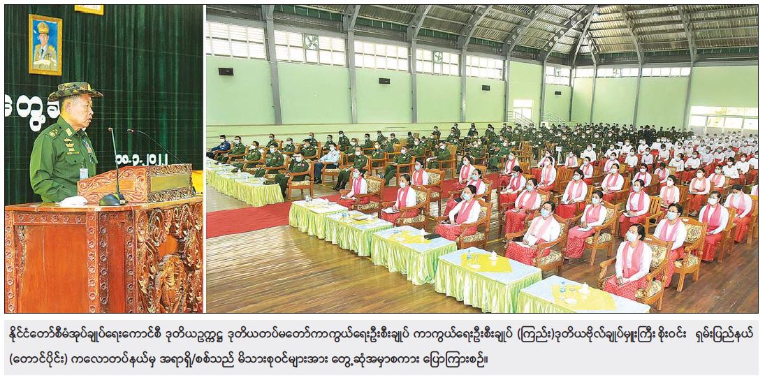 တစ်ဖက်တွင်လည်း တပ်မတော်ပြိုကွဲစေရန် နည်းမျိုးစုံအသုံးပြု၍ လုပ်ဆောင်လာပြီး တပ်မတော်အတွင်း ပြဿနာအမျိုးမျိုးချိုးဖောက်ကျူးလွန်ကာ အရေးယူခံရမည်ကို ကြောက်ရွံ့၍ စစ်ပြေးမှုကျူးလွန်သူ အရာရှိ၊ စစ်သည်များကို ဒီမိုကရေစီ သူရဲကောင်းအဖြစ် မြှောက်ပင့်၍ မီဒီယာနည်းလမ်းဖြင့် တပ်မတော်အတွင်း စည်းလုံးညီညွတ်မှု ပြိုကွဲနေသည့် အခြေအနေ၊ စစ်ဆင်ရေးရှုံးနိမ့်နေသည့် အခြေအနေ စသည်ဖြင့် တပ်မတော်ပြိုကွဲရေး စည်းလုံး ညီညွတ်မှု ပြိုကွဲရေးကို ဦးတည်လျက် ဝါဒဖြန့်မှုများ လုပ်ဆောင်လျက်ရှိကြောင်း၊ ၎င်းအပြင် အကြမ်းဖက်အဖွဲ့များအနေဖြင့် နယ်မြေအလိုက် ပြည်သူလူထု၏ အသက်အိုးအိမ်စည်းစိမ်ကို ကာကွယ်စောင့်ရှောက်ရန် လုံခြုံရေး တာဝန်ထမ်းဆောင်နေသည့် လုံခြုံရေးတပ်ဖွဲ့ဝင်များကို အလစ်အငိုက် ချောင်းမြောင်းတိုက်ခိုက်၍ စစ်ရေးအရ ဖိအားပေးခြိမ်းခြောက်ရန် ကြိုးစားလာ ကြောင်း၊ ၎င်းတို့၏ အဓိကရည်ရွယ်ချက်သည် တပ်မတော်ပြိုကွဲရေးပင်ဖြစ်ကြောင်း၊ ထိုကဲ့သို့ အကြမ်းဖက်သူများ၏ သွေးခွဲမှုများ ရှိစေကာမူ တပ်မတော်အနေဖြင့် တပ်တွင်းစည်းလုံး ညီညွတ်မှုမှာ ခိုင်မြဲလျက်ရှိပြီး “ဘယ်သူ ခွဲခွဲဒို့မကွဲ အမြဲစည်းလုံး မည်”ဟူသော ဆောင်ပုဒ်နှင့် အညီ ကျစ်လစ်သော စည်းလုံးညီညွတ်မှုဖြင့် ရပ်တည်လျက်ရှိကြောင်း၊ အူမတောင့်မှ သီလစောင့်မည်ဖြစ်ရာ တပ်မတော်သားများနှင့် မိသား စုဝင်များ၏ စားရေး၊ နေရေး၊ ဝတ်ရေး၊ သွားလာရေး၊ ကျန်းမားရေး၊ ပညာရေးတို့ အဆင်ပြေ ချောမွေ့စေရန် တာဝန်ရှိသူ အဆင့်ဆင့် အနေဖြင့် ဝတ္တရားအရ၊ တာဝန်အရ ကြိုးစားဖြည့်ဆည်း ဆောင်ရွက်ပေးရန်လိုကြောင်း၊ ထိုသို့ ဆောင်ရွက်ခြင်းဖြင့် တပ်မတော်သားများအနေဖြင့် လုပ်ငန်းတာဝန်ကို စိတ်လက်အေးချမ်းစွာ ဖြင့် နိုင်ငံ့အရေးကို အပြည့်အဝ အကောင်အထည်ဖော် ထမ်းဆောင်နိုင်မည်ဖြစ်ကြောင်း။