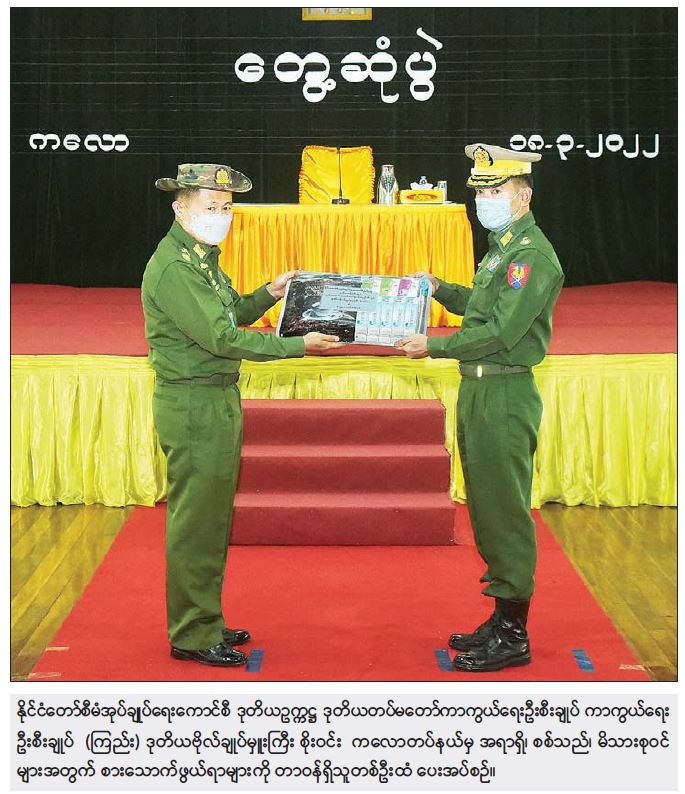 နိုင်ငံတော်စီမံအုပ်ချုပ်ရေးကောင်စီ ဒုတိယဥက္ကဋ္ဌ ဒုတိယတပ်မတော် ကာကွယ်ရေးဦးစီးချုပ် ကာကွယ်ရေးဦးစီးချုပ်(ကြည်း) ဒုတိယဗိုလ်ချုပ်မှူးကြီး စိုးဝင်းသည် ယနေ့မွန်းလွဲပိုင်းတွင် ရှမ်းပြည်နယ်(တောင်ပိုင်း)၊ ကလောမြို့ရှိ တပ်နယ်ခန်းမ၌ ကလောတပ်နယ်မှ အရာရှိ/စစ်သည် မိသားစုဝင်များအား တွေ့ဆုံအမှာစကား ပြောကြားသည်။