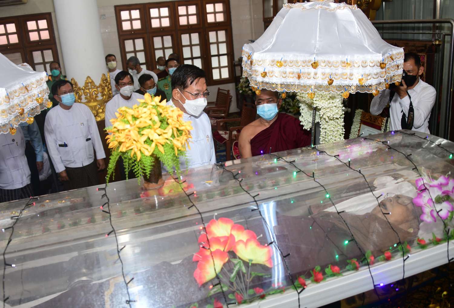 ဆရာတော်ဘုရားကြီး၏ ကြွင်းကျန်ရစ်သည့် ရုပ်ကလပ်တော်မြတ်အား နိုင်ငံတော်စီမံအုပ်ချုပ်ရေး ကောင်စီဥက္ကဋ္ဌ နိုင်ငံတော်ဝန်ကြီးချုပ် ဗိုလ်ချုပ်မှူးကြီး မင်းအောင်လှိုင်သည် ဇနီး ဒေါ်ကြူကြူလှ၊ ကောင်စီဝင်ဒုတိယ ဗိုလ်ချုပ်ကြီး မိုးမြင့်ထွန်း၊ ကောင်စီ အတွင်းရေးမှူး ဒုတိယဗိုလ်ချုပ်ကြီး အောင်လင်းဒွေး၊ သာသနာရေးနှင့် ယဉ်ကျေးမှုဝန်ကြီးဌာန ပြည်ထောင်စုဝန်ကြီး ဦးကိုကို၊ ရန်ကုန်တိုင်း ဒေသကြီးဝန်ကြီးချုပ် ဦးစိုးသိန်း၊ ကာကွယ်ရေးဦးစီးချုပ်(ရေ) ဗိုလ်ချုပ်ကြီး မိုးအောင်၊ ကာကွယ်ရေးဦးစီး ချုပ်(လေ) ဗိုလ်ချုပ်ကြီး ထွန်းအောင်၊ ကာကွယ်ရေးဦးစီးချုပ်ရုံးမှ တပ်မတော်အရာရှိ ကြီးများ၊ ရန်ကုန်တိုင်းစစ်ဌာနချုပ်တိုင်းမှူးနှင့် တာဝန်ရှိသူများ လိုက်ပါ၍ ယနေ့မွန်းလွဲ ပိုင်းတွင် သွားရောက်ဖူးမြော်ကြည်ညိုသည်။