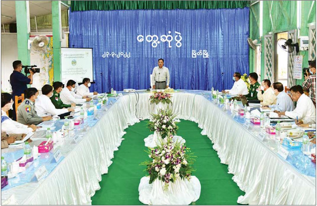 တနင်္သာရီတိုင်းဒေသကြီးသို့ ရောက်ရှိနေသော နိုင်ငံတော်စီမံအုပ်ချုပ်ရေးကောင်စီအဖွဲ့ဝင် ဒုတိယဗိုလ်ချုပ်ကြီး မိုးမြင့်ထွန်းနှင့် အဖွဲ့သည် ယနေ့မွန်းလွဲပိုင်းတွင် မြိတ်ခရိုင် အထွေထွေအုပ်ချုပ်ရေးဦးစီးဌာနရှိ ကျွန်းရတနာ အစည်းအဝေးခန်းမ၌ တနင်္သာရီတိုင်းဒေသကြီး အစိုးရအဖွဲ့ဌာနဆိုင်ရာများနှင့် တွေ့ဆုံသည်။