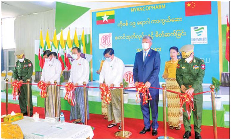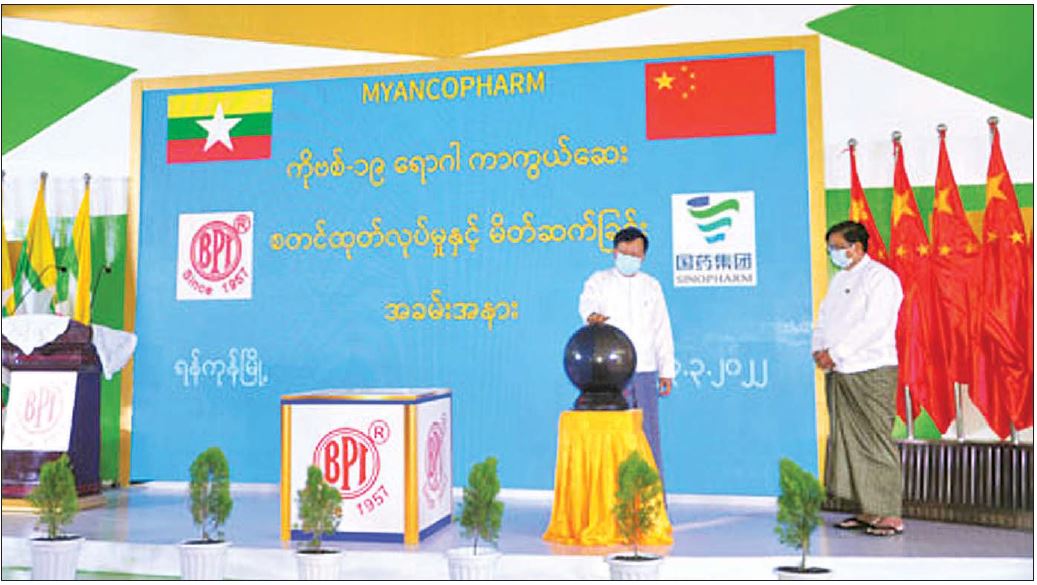 Myancopharm ကိုဗစ်-၁၉ ရောဂါ ကာကွယ်ဆေး စတင်ထုတ်လုပ်မှုနှင့် မိတ်ဆက်ခြင်း အခမ်းအနားကို ယနေ့နံနက်ပိုင်းက ရန်ကုန်တိုင်းဒေသကြီး လှည်းကူးမြို့နယ်ရှိ ဆေးဝါးစက်ရုံခွဲ (ရွာသာကြီး) ၌ ကျင်းပသည်။