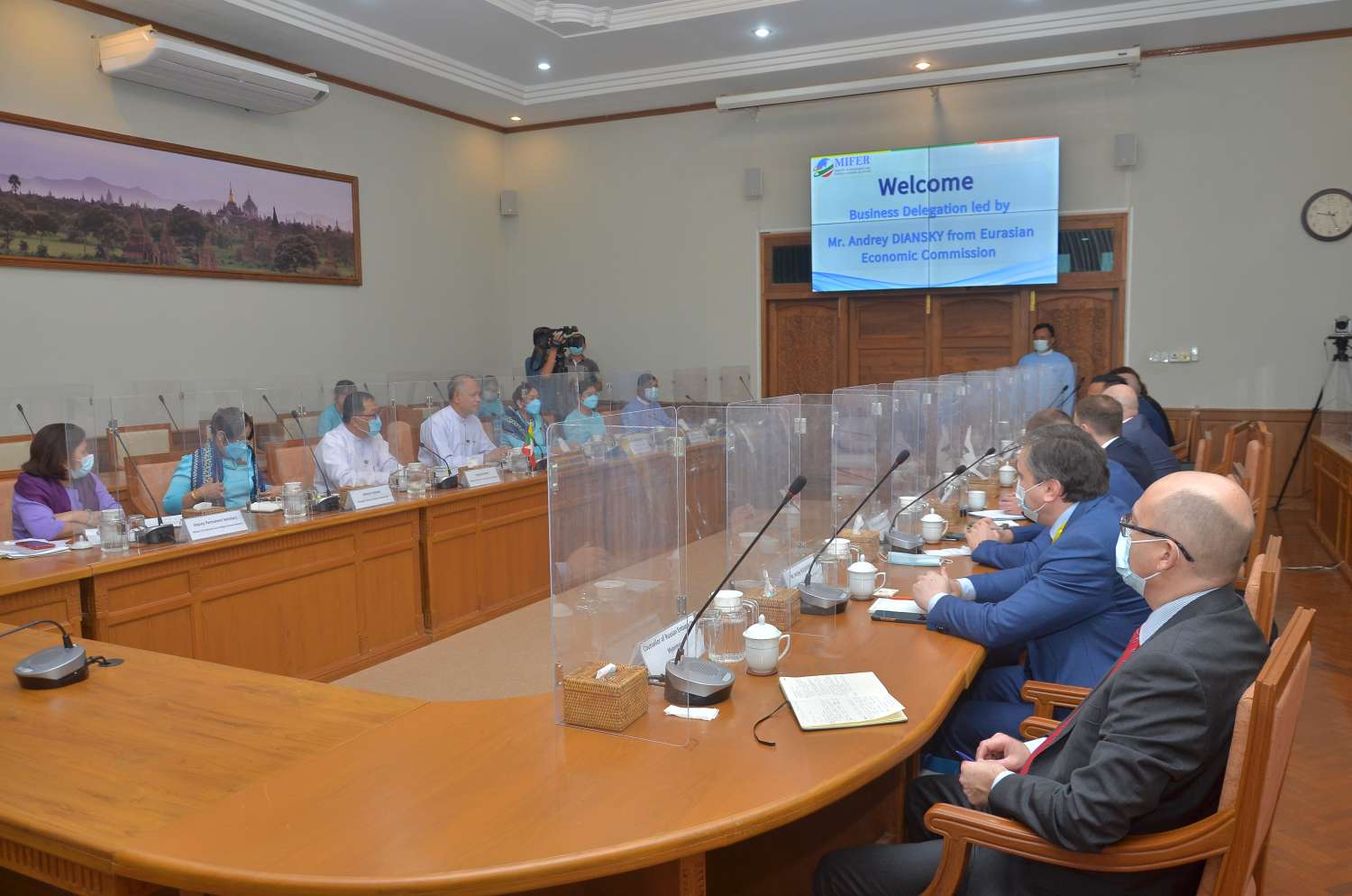ရင်းနှီးမြှုပ်နှံမှုနှင့် နိုင်ငံခြားစီးပွားဆက်သွယ်ရေး ဝန်ကြီးဌာန၊ ပြည်ထောင်စုဝန်ကြီး ဦးအောင်နိုင်ဦး သည် ယနေ့ နံနက် ၉ နာရီတွင် မြန်မာနိုင်ငံနှင့် ဥရောပအာရှစီးပွားရေး သမဂ္ဂတို့အကြား စီးပွားရေးပူးပေါင်းဆောင်ရွက်မှုများ မြှင့်တင်ရေးအတွက် ဥရောပအာရှ စီးပွားရေး ကော်မရှင်၊ အကြီးစားစီးပွားရေးလုပ်ငန်း ပူးပေါင်း ဆောင်ရွက်ရေး အတွင်းရေး မှူးချုပ်ရုံးမှ အကြီးအကဲ Mr. Andrey DIANSKY ဦးဆောင်သော စီးပွားရေး ကိုယ်စားလှယ် အဖွဲ့ကို ရုံးအမှတ် (၁) ဝန်ကြီးဌာန အစည်းအဝေးခန်းမ၌တွေ့ဆုံသည်။