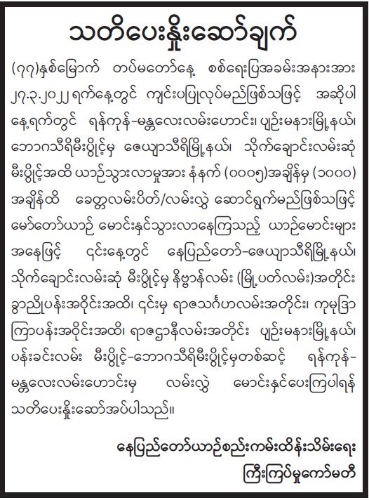 စက်သုံးဆီဖြန့်ဖြူးရောင်းချမှုနှင့်ပတ်သက်၍ ပြည်သူသို့ အသိပေးပန်ကြားချက်