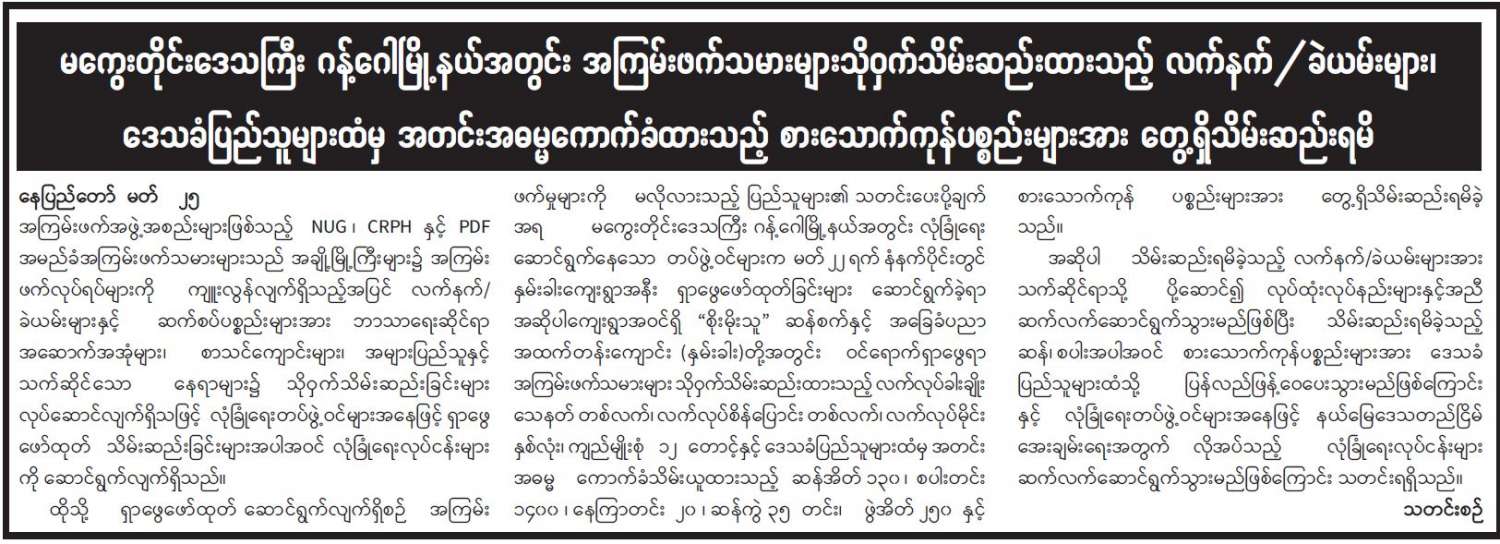 မကွေးတိုင်းဒေသကြီး ဂန့်ဂေါမြို့နယ်အတွင်း အကြမ်းဖက်သမားများသိုဝှက်သိမ်းဆည်းထားသည့် လက်နက်/ခဲယမ်းများ၊ ဒေသခံပြည်သူများထံမှ အတင်းအဓမ္မကောက်ခံထားသည့် စားသောက်ကုန် ပစ္စည်းများအား တွေ့ရှိသိမ်းဆည်းရမိ 03/26/2022