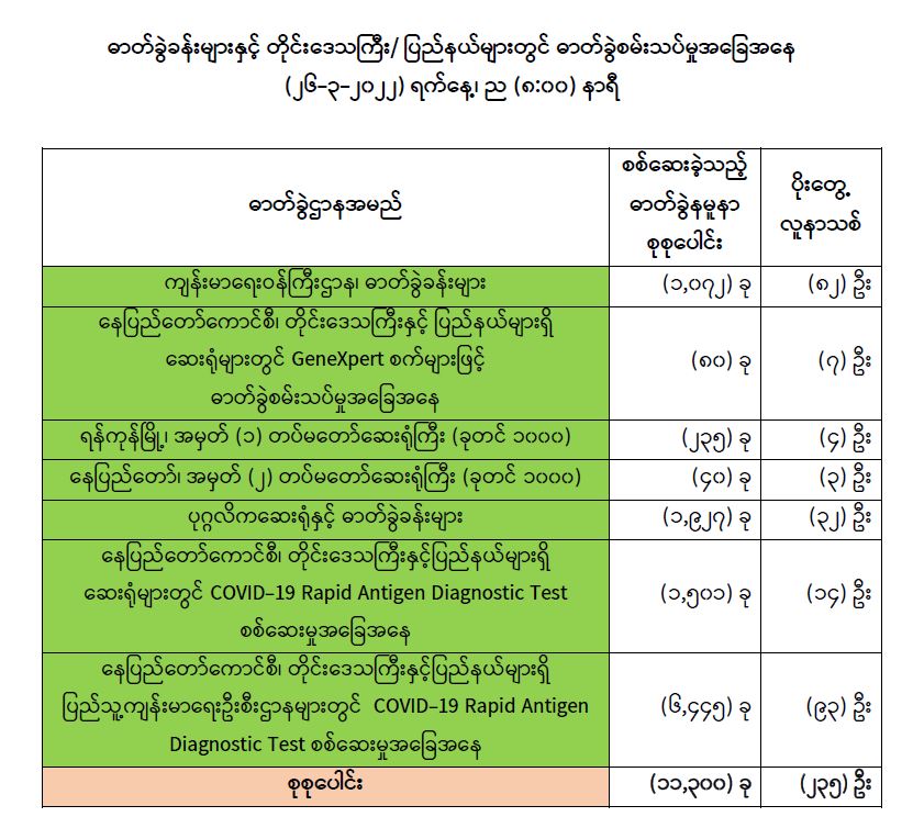 သို့ဖြစ်ပါ၍ ယနေ့အထိ ဓာတ်ခွဲနမူနာစုစုပေါင်း (၇,၅၈၈,၂၂၄) ခုအားစစ်ဆေးခဲ့ပြီး COVID-19 ဓာတ်ခွဲအတည်ပြုလူနာ စုစုပေါင်း (၆၁၀,၇၂၈) ဦး ရှိပြီဖြစ်ပါသည်။