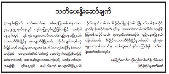 စက်သုံးဆီဖြန့်ဖြူးရောင်းချမှုနှင့်ပတ်သက်၍ ပြည်သူသို့ အသိပေးပန်ကြားချက်