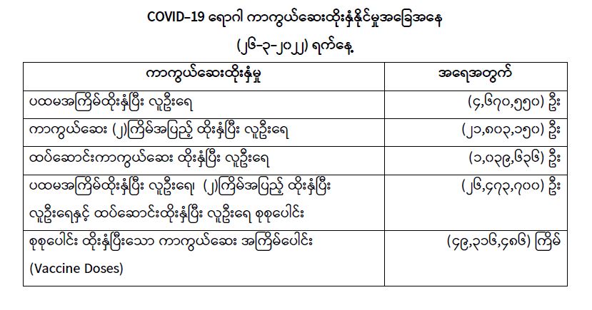 COVID-19 ရောဂါ ကာကွယ်ထိန်းချုပ်ရေးအတွက် တိုင်းဒေသကြီး/ပြည်နယ်များတွင် COVID-19 ရောဂါကာကွယ်ဆေးကို ဦးတည်အုပ်စုများသတ်မှတ်၍ ထိုးနှံပေးလျက်ရှိရာ (၂၆-၃-၂၀၂၂) ရက်နေ့ အထိ လူဦးရေ စုစုပေါင်း (၂၆,၄၇၃,၇၀၀) ဦးအား ထိုးနှံပေးပြီးဖြစ်၍ ပထမအကြိမ်ထိုးနှံပြီးစီးသူ (၄,၆၇၀,၅၅၀) ဦး၊ ကာကွယ်ဆေးနှစ်ကြိမ်အပြည့် ထိုးနှံပြီးစီးသူ (၂၁,၈၀၃,၁၅၀) ဦးနှင့် ထပ်ဆောင်း ကာကွယ်ဆေး ထိုးနှံပြီးစီးသူ (၁,၀၃၉,၆၃၆) ဦး ရှိပြီဖြစ်ပါသည်။ သို့ဖြစ်ပါ၍ (၂၆-၃-၂၀၂၂) ရက်နေ့အထိ မြန်မာနိုင်ငံတွင် COVID-19 ရောဂါကာကွယ်ဆေး အကြိမ်ရေ စုစုပေါင်း (၄၉,၃၁၆,၄၈၆) ကြိမ် ထိုးနှံပြီး ဖြစ်ပါသည်။