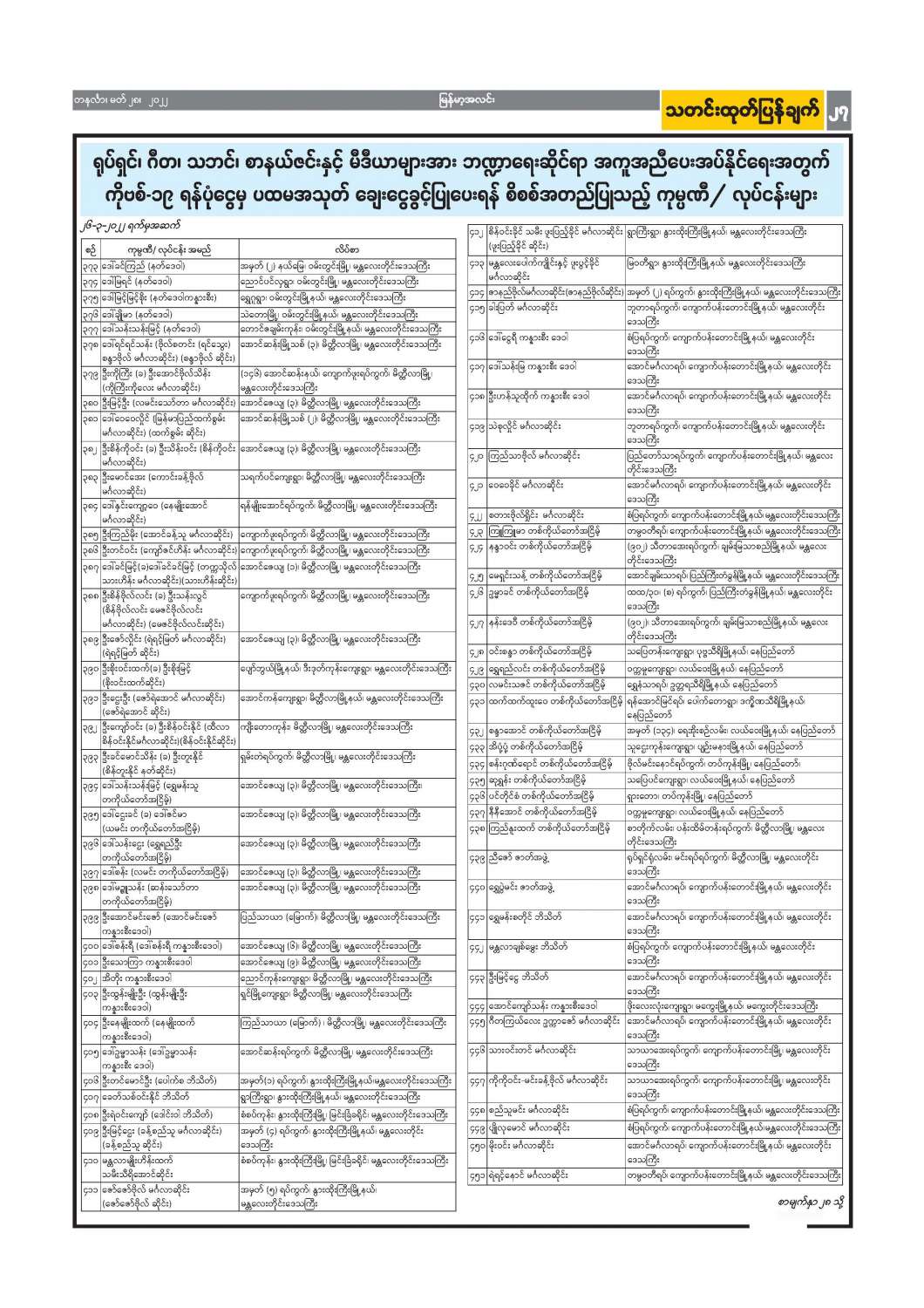 ရုပ်ရှင်၊ ဂီတ၊ သဘင်၊ စာနယ်ဇင်းနှင့် မီဒီယာများအား ဘဏ္ဍာရေးဆိုင်ရာ အကူအညီပေးအပ်နိုင်ရေး အတွက် ကိုဗစ်-၁၉ ရန်ပုံငွေမှ ပထမအသုတ် ချေးငွေခွင့်ပြုပေးရန် စိစစ်အတည်ပြုသည့် ကုမ္ပဏီ/ လုပ်ငန်းများ