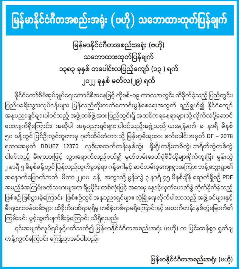 အနုပညာရှင်များ စီးနင်းလိုက်ပါလာသည့် မီးရထားကို PDF အမည်ခံ အကြမ်းဖက်သမားများက မိုင်းခွဲတိုက်ခိုက်မှုအပေါ် မြန်မာနိုင်ငံဂီတ အစည်းအရုံး(ဗဟို) က ပြင်းထန်စွာ ရှုတ်ချကန့်ကွက်ကြောင်း သဘောထား ထုတ်ပြန် 03/30/2022