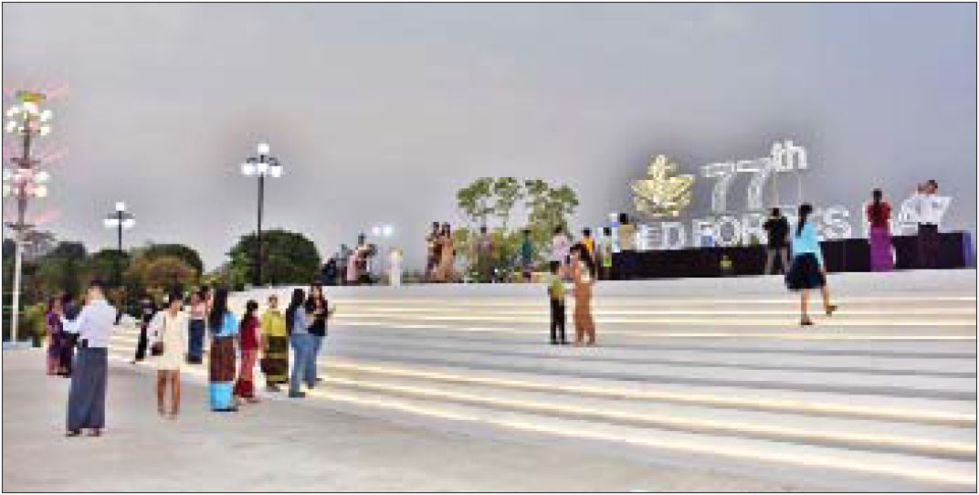 (၇၇)နှစ်မြောက် တပ်မတော်နေ့ကို ဂုဏ်ပြုသောအားဖြင့် နေပြည်တော်ကောင်စီနယ်မြေအတွင်းရှိ ဘောဂသီရိ အဝေးပြေးကားဝင်းအနီးရှိ မီးပွိုင့် လမ်းဆုံတွင်လည်းကောင်း၊ နေပြည်တော် တိုင်းစစ်ဌာနချုပ်အနီး မီးပွိုင့်လမ်းဆုံတွင် လည်းကောင်း၊ အမှတ်(၃)စစ်ကြောရေးနှင့် တည်းခိုရေးစခန်းအနီး လမ်းဆုံတွင် လည်းကောင်း၊ ပင်လောင်းမီးပွိုင့် လမ်းဆုံနှင့် ကာကွယ်ရေးဦးစီးချုပ်ရုံး(ကြည်း)ဝင်း အတွင်း၌ လည်းကောင်း မျိုးချစ်စိတ်ဓာတ်ရှင်သန် ထက်မြက်ပြီး ဇာတိသွေး၊ ဇာတိမာန်တက်ကြွစေမည့် တပ်မတော်(ကြည်း၊ ရေ၊ လေ) စစ်သည်များ၏ လှုပ်ရှားမှုပုံရိပ်များကို ဖော်ကျူးထားသော ပိုစတာ ကြီးများကို စိုက်ထူထားရှိသည်။