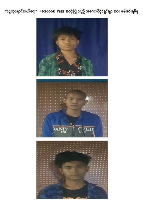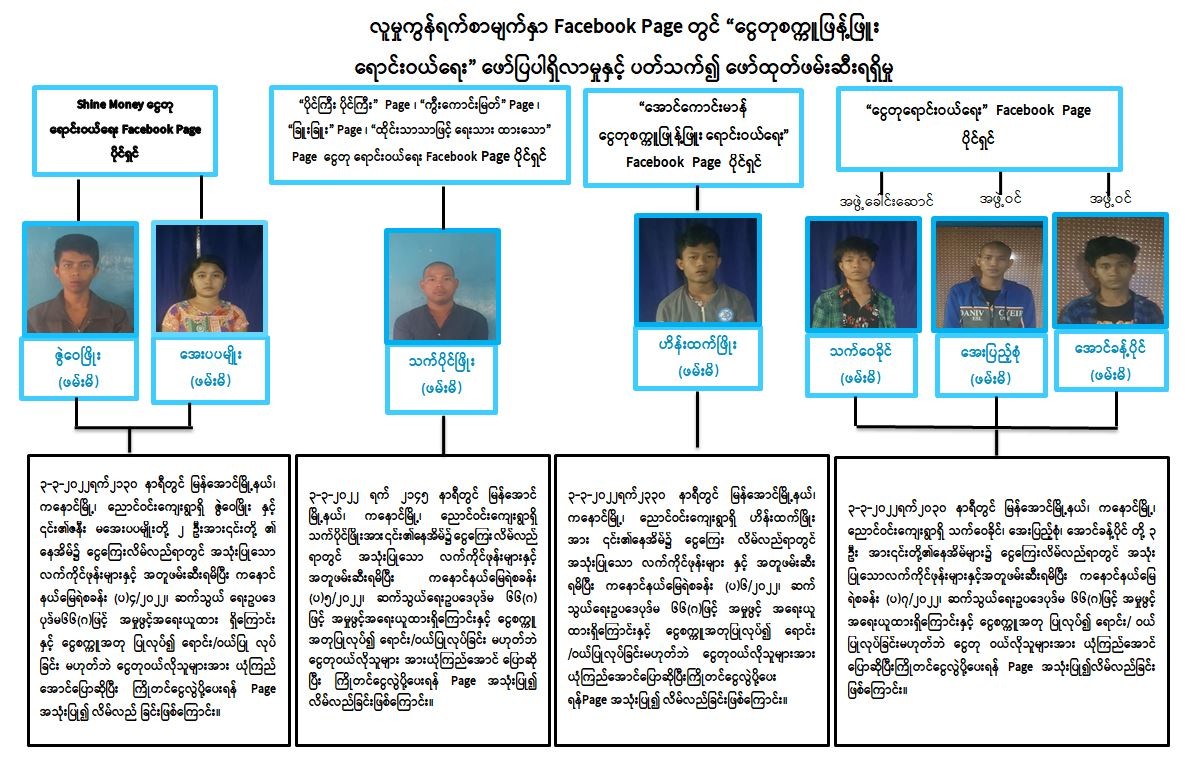အလားတူ “ငွေတုရောင်းဝယ်ရေး” Facebook Page ကို အသုံးပြုသည့် အကောင့်ပိုင်ရှင်အား စုံစမ်းဖော်ထုတ်ခဲ့ရာ မြန်အောင်မြို့နယ်၊ ကနောင်မြို့၊ ကျွဲတဲကုန်းကျေးရွာအုပ်စု၊ ညောင်ဝင်း ကျေးရွာနေ သက်ဝေခိုင်(၁၈) နှစ်၊ (ဘ)ဦးရဲမြင့်၊ အေးပြည့်စုံ(၁၇)နှစ်၊ (ဘ)ဦးမြင့်ဌေး၊ အောင်ခန့်ပိုင်(၁၇)နှစ်၊ (ဘ)ဦးစိန်သောင်းတို့ ၃ ဦးမှ အသုံးပြုလျက်ရှိကြောင်း သိရှိရသည့် အတွက် မတ်လ ၃ ရက်နေ့ ည ၁၀ နာရီခွဲတွင် ၎င်းတို့၏ နေအိမ်များသို့ ဝင်ရောက်ရှာဖွေခဲ့ရာ ငွေစက္ကူ အတုနှင့်ပတ်သက်၍ ဆက်စပ်ပစ္စည်းများ ရှာဖွေတွေ့ရှိခြင်း မရှိသော်လည်း ငွေစက္ကူ အတုများရရှိမည်ဖြစ်ကြောင်း အခြားသူများ ယုံကြည်အောင်ပြောဆိုကာ ငွေကြေးလိမ်လည်ရ ယူခဲ့ရာ၌ အသုံးပြုခဲ့သော Facebook Page များဖွင့်လှစ်ထားသည့် လက်ကိုင် ဖုန်း ၇ လုံးတို့ကို သိမ်းဆည်းရမိခဲ့ပါသည်။