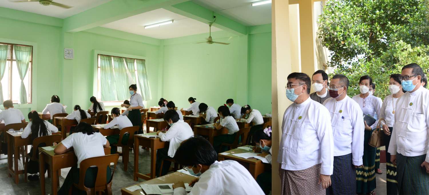 ပညာရေးဝန်ကြီးဌာန ပြည်ထောင်စုဝန်ကြီး ဒေါက်တာညွန့်ဖေသည် ဒုတိယဝန်ကြီးများဖြစ်ကြသော ဒေါက်တာဇော်မြင့်၊ ဦးဇော်ဝင်း၊ အမြဲတမ်းအတွင်းဝန် ဒေါက်တာစိုးဝင်း၊ အခြေခံပညာဦးစီးဌာန ညွှန်ကြားရေးမှူးချုပ် ဦးကျော်စွာသွင်နှင့်အတူ ယနေ့နံနက်ပိုင်းတွင် နေပြည်တော်၊ အမှတ်(၆) အခြေခံပညာအထက်တန်းကျောင်းရှိ ၂၀၂၂ နှစ်၊ တက္ကသိုလ်ဝင်တန်းစာမေးပွဲ စာစစ်ဌာနသို့ ရောက်ရှိပြီး တက္ကသိုလ်ဝင်တန်း စာမေးပွဲပထမနေ့ မြန်မာစာဘာသာ ဖြေဆိုနေမှုများကို လှည့်လည်ကြည့်ရှုပြီး သက်ဆိုင်ရာတာ၀န်ရှိသူများအား ၂၀၂၂ ပြည့်နှစ်၊ တက္ကသိုလ်ဝင်တန်းစာမေးပွဲ ဝင်ရောက်ဖြေဆိုကြသည့် ကျောင်းသား ကျောင်းသူများ စည်းကမ်းရှိစွာဖြင့် စိတ်အေးချမ်းသာစွာ စာမေးပွဲဖြေဆိုနိုင်ရေး၊ ကြီးကြပ်ရေးမှူး၊ လက်ထောက်ကြီးကြပ်ရေးမှူးများ လိုက်နာဆောင်ရွက် ကြရမည့် တာ၀န်၀တ္တရားများကို ကျေပွန်စွာဆောင်ရွက်၍ တက္ကသိုလ်ဝင်တန်းစာမေးပွဲ အောင်မြင်စွာကျင်းပပြီးစီးနိုင်ရေး ဝိုင်း၀န်းကူညီဆောင်ရွက်ပေးကြရန် မှာကြားသည်။