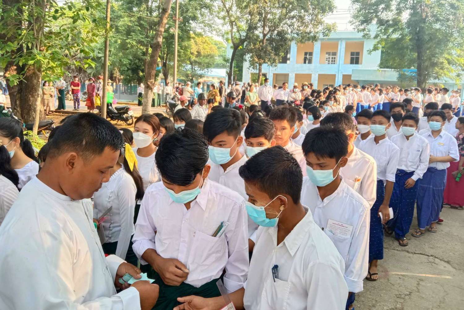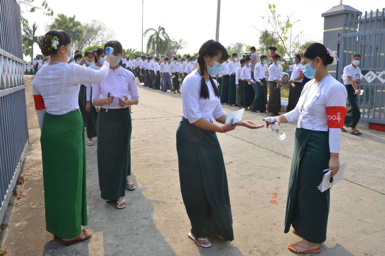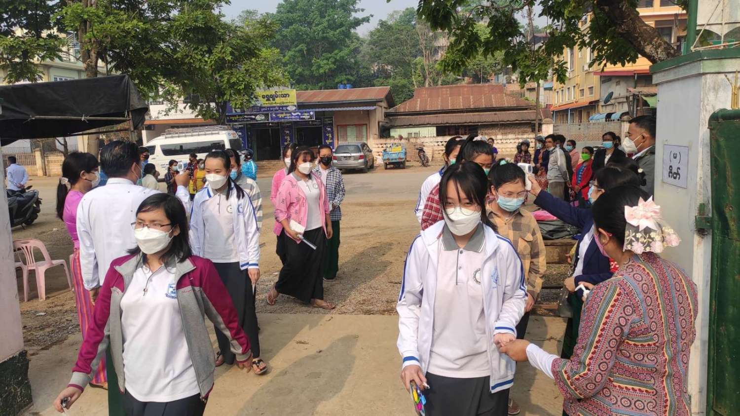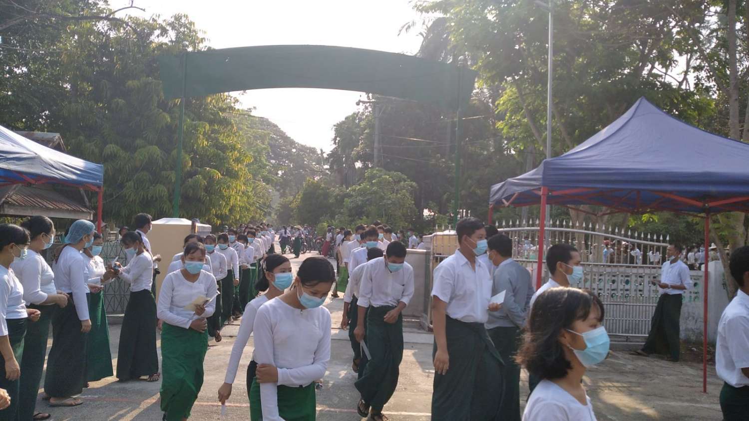 စာမေးပွဲ ဖြေဆိုခြင်းမပြုမီ ကိုဗစ်-၁၉ ရောဂါဆိုင်ရာ စည်းမျဉ်း/စည်းကမ်းများနှင့်အညီ Mask များ တပ်ဆင်လာစေခြင်း၊ အပူချိန်တိုင်းတာခြင်း၊ စာမေးပွဲ ဖြေဆိုခွင့်ကတ်များ မှန်/မမှန် စစ်ဆေးခြင်း များကို ဆရာ၊ ဆရာမများက စနစ်တကျ စစ်ဆေးခြင်းများကို ဆောင်ရွက်ကြသည်။