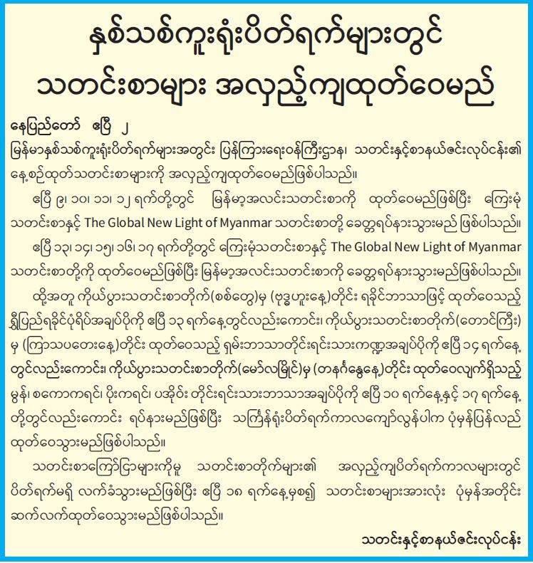 နှစ်သစ်ကူးရုံးပိတ်ရက်များတွင် သတင်းစာများ အလှည့်ကျထုတ်ဝေမည်