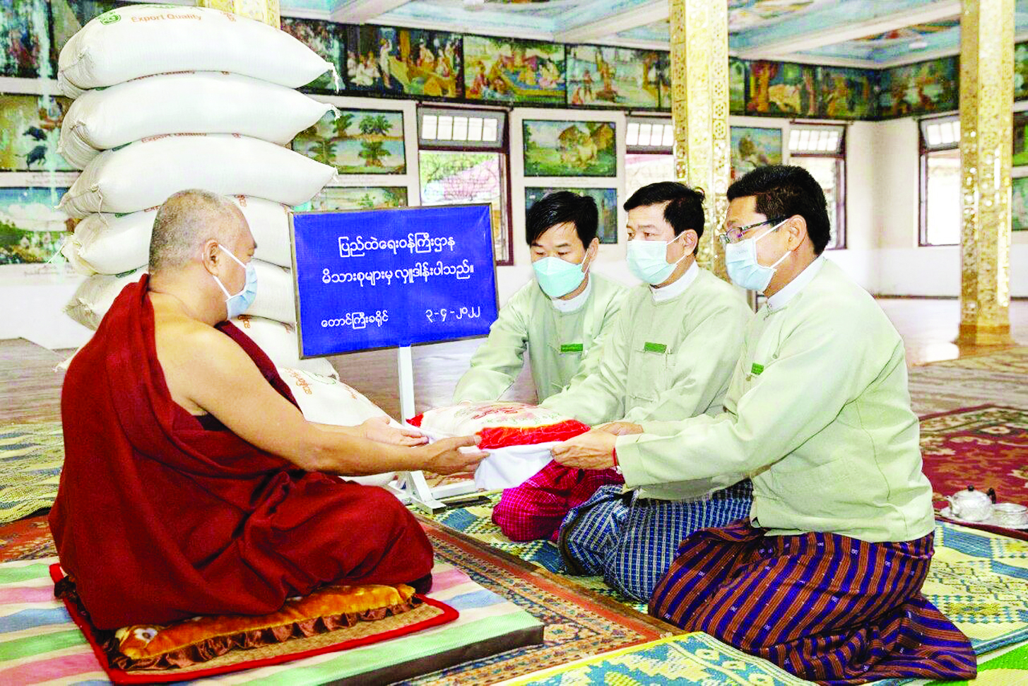 ထိုသို့ဆောင်ရွက်လျက်ရှိရာ ယနေ့တွင် နေပြည်တော်ကောင်စီနယ်မြေ ဇမ္ဗူသီရိမြို့နယ်ရှိ မစိုးရိမ် တိုက်သစ် ကျောင်းတိုက်သို့ လည်းကောင်း၊ ကရင် ပြည်နယ် ဘားအံမြို့နယ်ရှိ ခွယ်ကဘောင် ပညာဥယျာဉ်ကျောင်းတိုက်သို့လည်းကောင်း၊ ပဲခူးတိုင်းဒေသကြီး ပဲခူးမြို့နယ်ရှိ မင်္ဂလာရာမ ဘုန်းကြီးကျောင်းသို့ လည်းကောင်း၊ မန္တလေးတိုင်းဒေသကြီး မဟာအောင်မြေမြို့နယ်ရှိ မဟာဝိဇယ ကျောင်းတိုက်သို့လည်းကောင်း၊ မွန်ပြည်နယ် မော်လမြိုင်မြို့နယ်ရှိ ရိုးဂိုး ကျောင်းဟောင်း ကျောင်းတိုက်သို့ လည်းကောင်း၊ ရှမ်းပြည်နယ် ကလောမြို့နယ်ရှိ မဟာဓမ္မိကာရာမသိမ်တောင် ပရိယတ္တိစာသင်တိုက်နှင့် လွိုင်လင်မြို့နယ်ရှိ သာသနာဝိပုလဓာတ်တော် ပရိယတ္တိ စာသင်တိုက်သို့ လည်းကောင်း ဆရာတော်၊ သံဃာတော်များအတွက် ဆွမ်းဆန်တော်များကို တာဝန်ရှိသူများက သွားရောက်ဆက်ကပ်လှူဒါန်းခဲ့ကြကြောင်း သိရသည်။