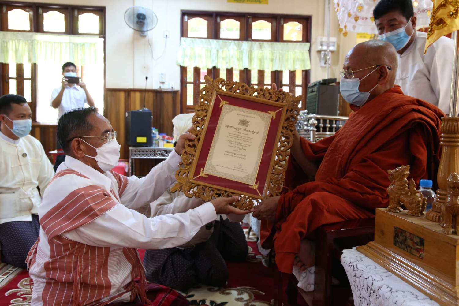 နိုင်ငံတော်စီမံအုပ်ချုပ်ရေးကောင်စီအဖွဲ့ဝင် မန်းငြိမ်းမောင်၊ ကရင်ပြည်နယ်ဝန်ကြီးချုပ် ဦးစောမြင့်ဦး၊ ပြည်နယ်တရားလွှတ်တော် တရားသူကြီးချုပ် ဒေါ်ခင်ဆွေထွန်း၊ ပြည်နယ်အစိုးရအဖွဲ့ဝင်ဝန်ကြီးများ၊ တာဝန်ရှိသူများသည် ယနေ့နံနက်ပိုင်းတွင် ၂၀၂၂ ခုနှစ် သာသနာ တော်ဆိုင်ရာ ဘွဲ့တံဆိပ်တော်ရ သံဃာတော်အရှင်သူမြတ်များအား ဘွဲ့တံဆိပ်တော်များ ဆက်ကပ်လှူဒါန်းကြသည်။