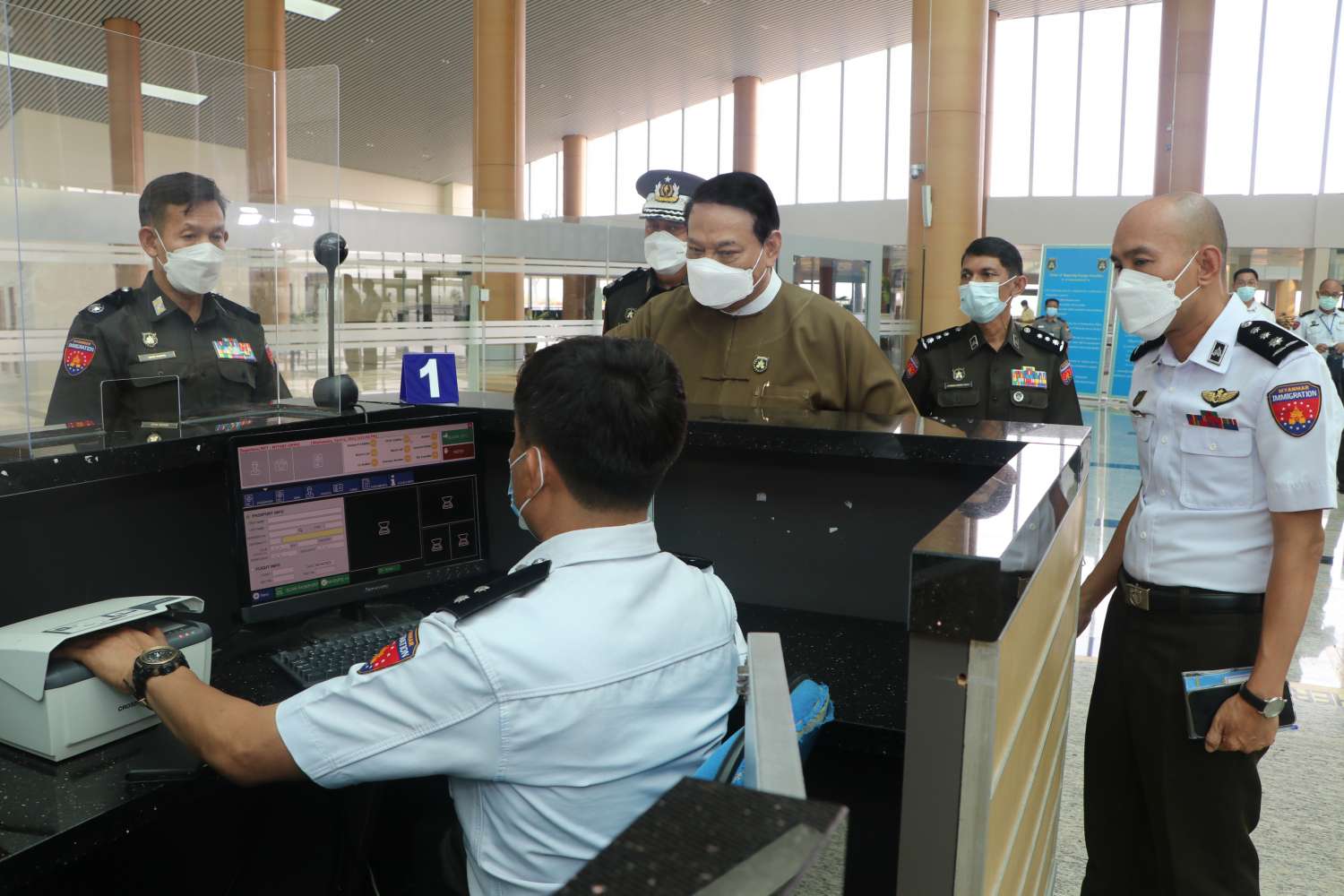 ထို့နောက် ပြည်ထောင်စုဝန်ကြီးသည် နေပြည်တော် အပြည်ပြည်ဆိုင်ရာလေဆိပ် ပြည်ပထွက်ခွာနေရာရှိ လူဝင်မှုစစ်ဆေးရေးကောင်တာများ၊ ဆိုက်ရောက်ဗီဇာ (Visa on Arrival) ကောင်တာနှင့် ပြည်ပဆိုက်ရောက်နေရာရှိ လူဝင်မှုစစ်ဆေးရေးကောင်တာများကို လှည့်လည် ကြည့်ရှု စစ်ဆေးရာ တာဝန်ရှိသူများက ခရီးသည်များအတွက် လူဝင်မှုစစ်ဆေးဆောင်ရွက်မည့် အခြေအနေများကို လိုက်လံရှင်းလင်းတင်ပြပြီး ပြည်ထောင်စုဝန်ကြီးက လုံခြုံရေးသတိ၊ ကျန်းမာရေးအသိတို့ဖြင့် ဂရုပြုဆောင်ရွက်ကြရေးမှာကြားကာ လုပ်ငန်းလိုအပ်ချက်များ ဖြည့်ဆည်း ဆောင်ရွက်ပေးခဲ့ကြောင်း သိရသည်။