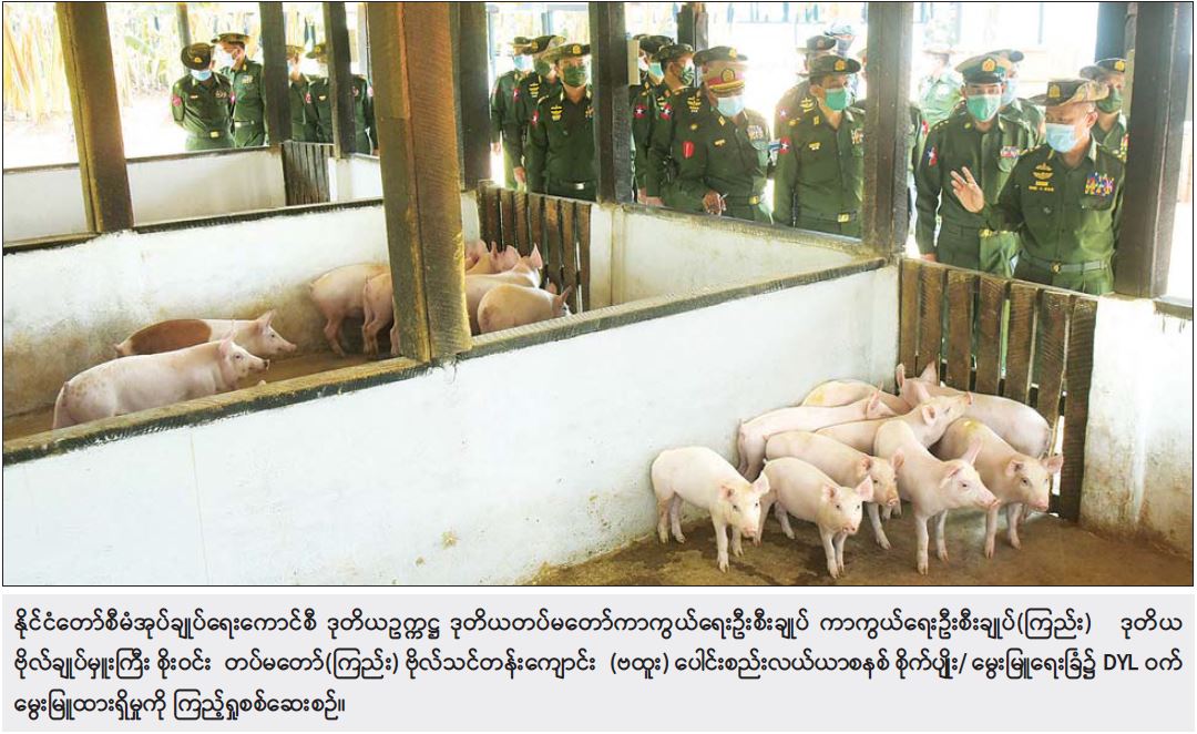 ဆက်လက်၍ နိုင်ငံတော်စီမံအုပ်ချုပ်ရေးကောင်စီ ဒုတိယဥက္ကဋ္ဌ ဒုတိယတပ်မတော် ကာကွယ်ရေးဦးစီးချုပ် ကာကွယ် ရေးဦးစီးချုပ်(ကြည်း)နှင့် အဖွဲ့ဝင် များသည် တပ်မတော် (ကြည်း) ဗိုလ်သင်တန်းကျောင်း (ဗထူး) ပေါင်းစည်းလယ်ယာစနစ် စိုက်ပျိုး/ မွေးမြူရေးခြံသို့ သွားရောက်ပြီး ဥစားကြက်၊ အသားတိုးကြက်၊ DYLဝက်နှင့် နို့စားနွားမွေးမြူထားရှိမှု၊ ရာသီသီးနှံများ စိုက်ပျိုး မွေးမြူထားရှိမှုများအား ကြည့်ရှု စစ်ဆေးသည်။