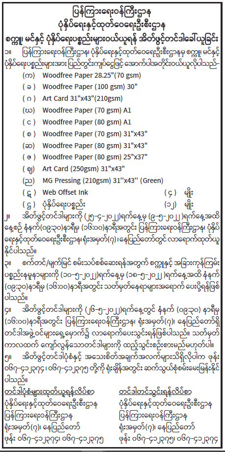 ပြန်ကြားရေးဝန်ကြီးဌာန ပုံနှိပ်ရေးနှင့်ထုတ်ဝေရေးဦးစီးဌာန စက္ကူ၊ မင်နှင့် ပုံနှိပ်ရေးပစ္စည်းများဝယ်ယူရန် အိတ်ဖွင့်တင်ဒါခေါ်ယူခြင်း