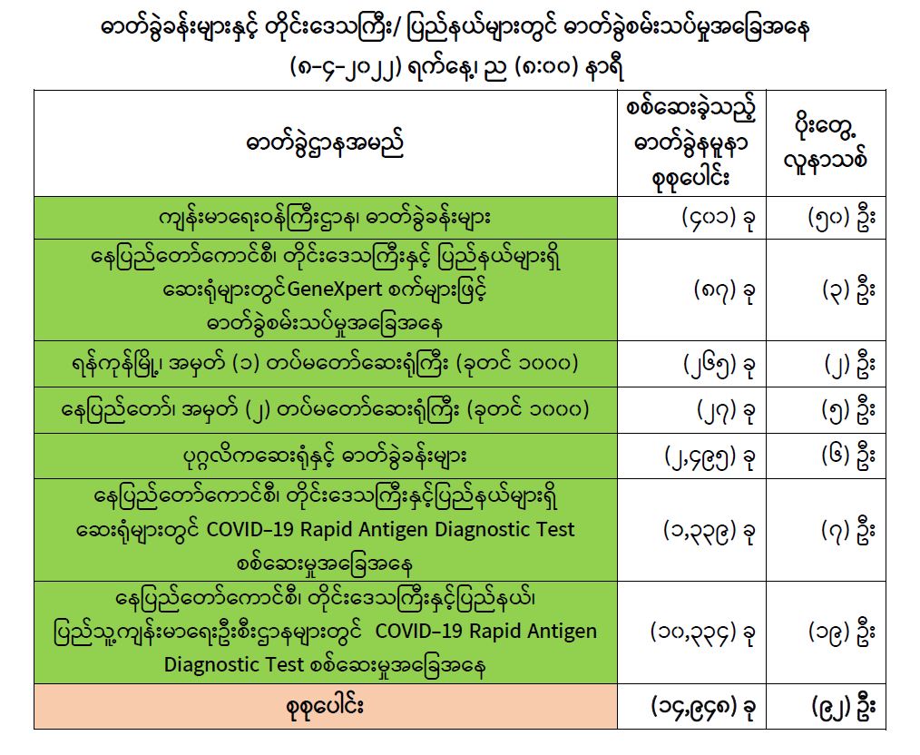 သို့ဖြစ်ပါ၍ ယနေ့အထိ ဓာတ်ခွဲနမူနာစုစုပေါင်း(၇,၇၆၁,၄၀၀) ခုအားစစ်ဆေးခဲ့ပြီး COVID-19 ဓာတ်ခွဲအတည်ပြုလူနာ စုစုပေါင်း (၆၁၂,၂၂၄) ဦး ရှိပြီ ဖြစ်ပါသည်။