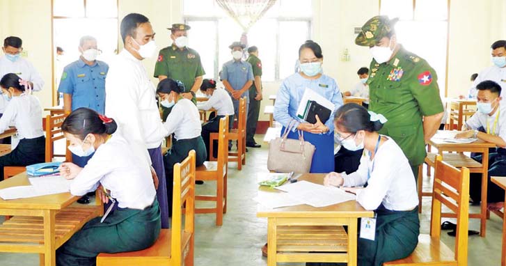 နယ်စပ်ရေးရာဝန်ကြီးဌာန ပြည်ထောင်စုဝန်ကြီး ဒုတိယဗိုလ်ချုပ်ကြီး ထွန်းထွန်းနောင်သည် စစ်ကိုင်းတိုင်း ဒေသကြီး လုံခြုံရေးနှင့်နယ်စပ်ရေးရာဝန်ကြီး ဗိုလ်မှူးကြီး ဝင်းတင်စိုးနှင့်အတူ ယမန်နေ့နံနက်ပိုင်းတွင် စစ်ကိုင်းတိုင်းဒေသကြီး ရွာသစ်ကြီး ကျေးရွာရှိ ပြည်ထောင်စုတိုင်းရင်းသားလူမျိုးများ ဖွံ့ဖြိုးရေးတက္ကသိုလ်သို့ ရောက်ရှိခဲ့ပြီး ဖွံ့ဖြိုးရေး တက္ကသိုလ်၌ ၂၀၁၉-၂၀၂၀ ပညာသင်နှစ် ပညာရေးဘွဲ့ ငါးနှစ်သင်တန်း၊ အမှတ်စဉ်(၅) စတုတ္ထနှစ် (ဒုတိယနှစ်ဝက်) သင်တန်းတက်ရောက်နေသည့် သင်တန်းသား သင်တန်းသူများ၏ ကိုဗစ်-၁၉ စည်းကမ်းချက် များနှင့်အညီ စာမေးပွဲဖြေဆိုနေမှုကို ကြည့်ရှုအားပေးသည်။
