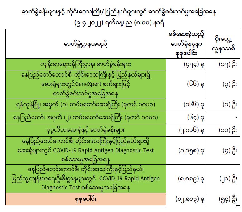 သို့ဖြစ်ပါ၍ ယနေ့အထိ ဓာတ်ခွဲနမူနာစုစုပေါင်း (၇,၇၇၄,၂၁၃) ခုအားစစ်ဆေးခဲ့ပြီး COVID-19 ဓာတ်ခွဲအတည်ပြုလူနာ စုစုပေါင်း (၆၁၂,၂၇၈) ဦး ရှိပြီ ဖြစ်ပါသည်။